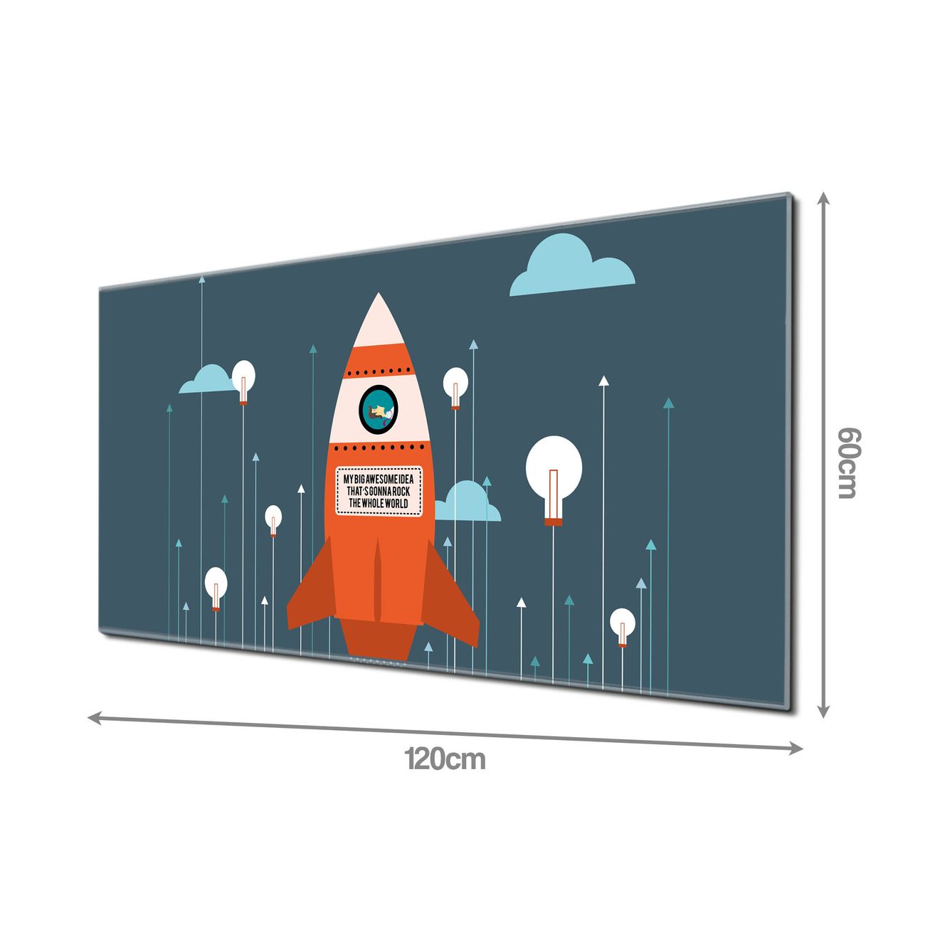 Material: 4mm Sicherheitsglas mit Metallrückwand Eigenschaften: beschreibbar, magnetisch, kratzfest Maße: 120x60x0,6cm, 10,80kg schwer Motiv Nummer 11345 Rock the World Zubehör: inklusive 4 Neodym-Magnete