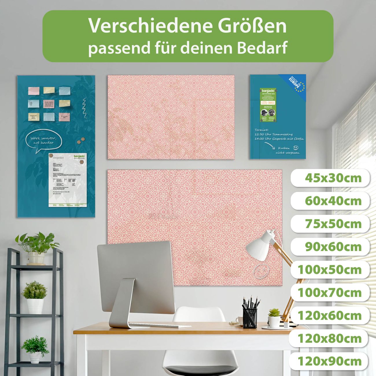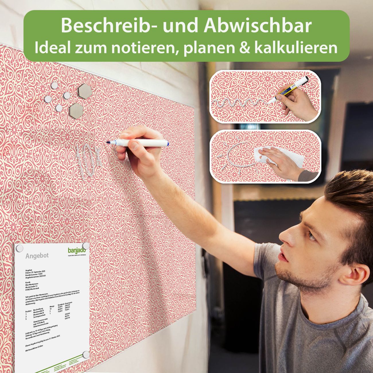 Ein Stück Design, das Ihren Alltag organisiert. Schreiben, heften, inspirieren - alles an einem Ort. Qualität, die man spürt. Montage leicht gemacht. Handwerk mit Herz - veredelt in Sachsen. Einzigartiges Design mit Motiv Motiv Rosa Arabesque Beschreibbare Glasoberfläche, leicht zu reinigen Starke Magnetkraft durch Stahlrückwand Inklusive 4 Neodym-Magneten Flexible Montageoptionen Handveredelt in Sachsen - Qualität, die bleibt