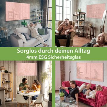 Material: 4mm Sicherheitsglas mit Metallrückwand Eigenschaften: beschreibbar, magnetisch, kratzfest Maße: 120x80x0,6cm, 14,40kg schwer Motiv Nummer 11446 Rosa Arabesque Zubehör: inklusive 4 Neodym-Magnete