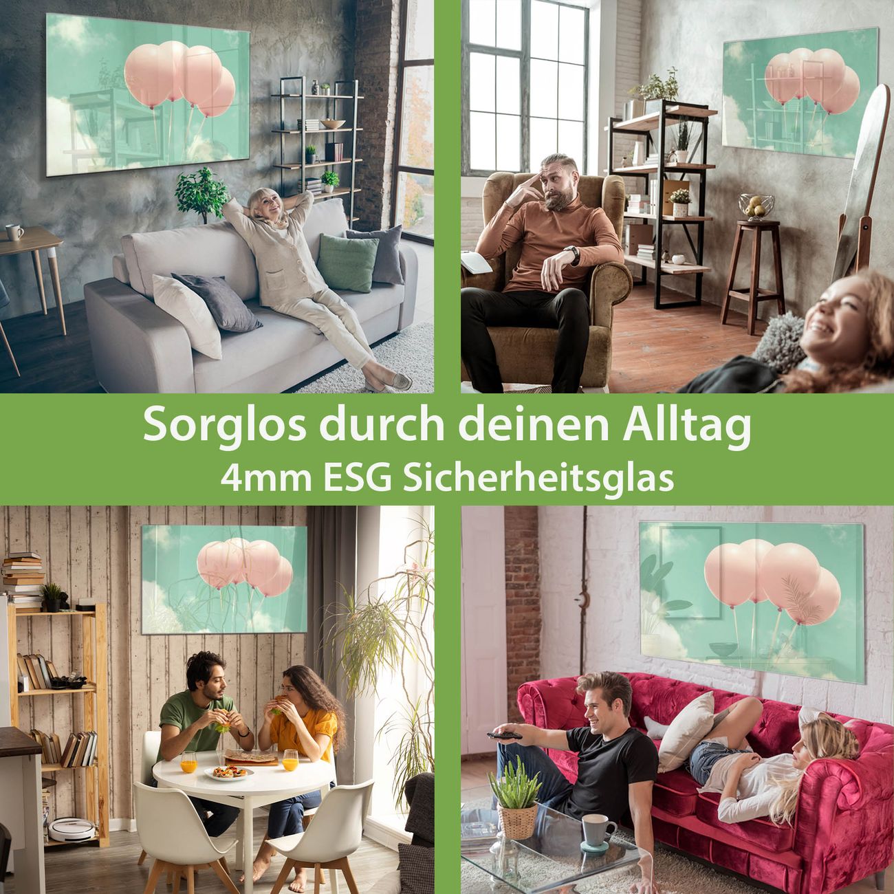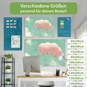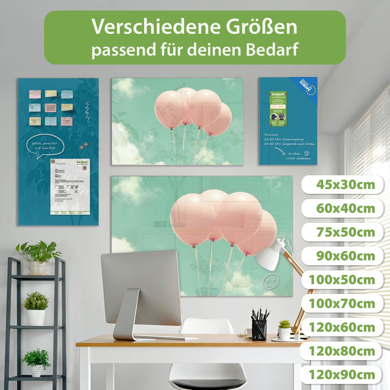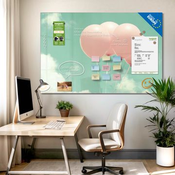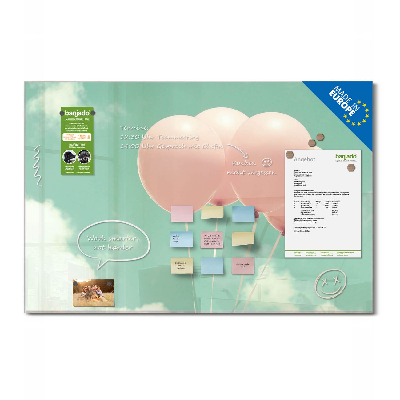 Material: 4mm Sicherheitsglas mit Metallrückwand Eigenschaften: beschreibbar, magnetisch, kratzfest Maße: 90x60x0,6cm, 8,10kg schwer Motiv Nummer 11434 Rosa Ballons Zubehör: inklusive 4 Neodym-Magnete