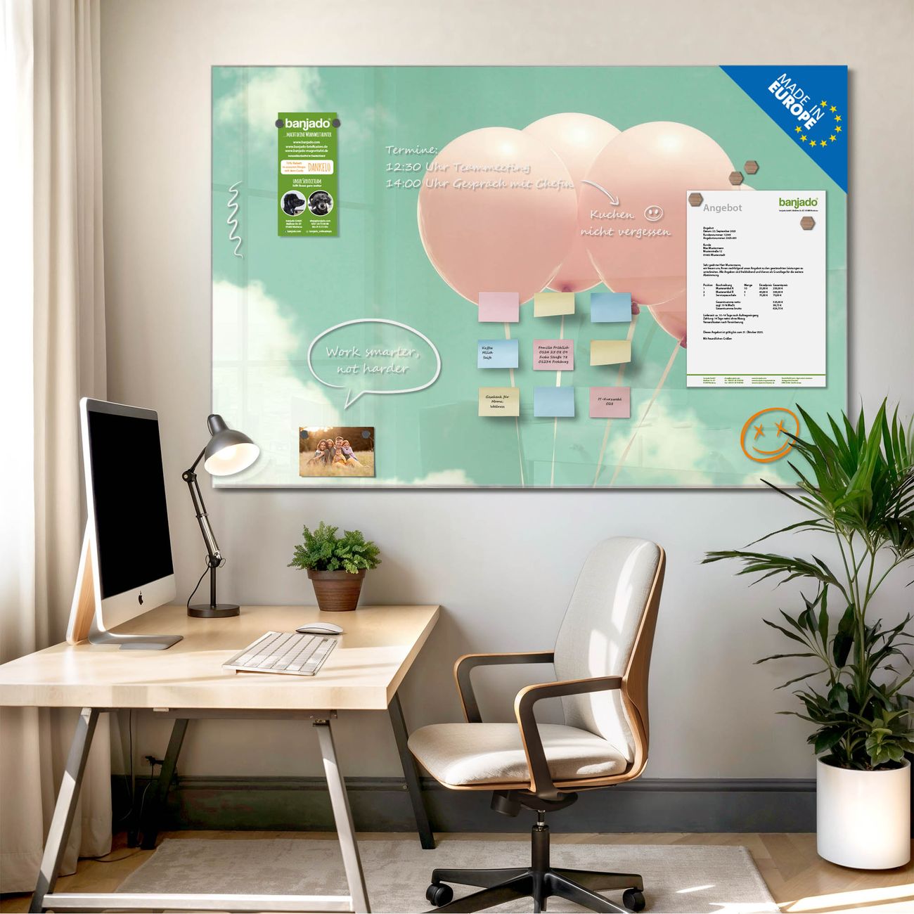 Die banjado Glas Magnettafel mit dem Motiv Motiv Rosa Ballons verbindet Funktionalität mit Stil. Sie ersetzt das Zettelchaos durch klare Strukturen und bringt dabei eine warme, natürliche Atmosphäre in Ihr Zuhause. Ob im Büro, in der Küche oder im Eingangsbereich - dieses Design-Board zieht Blicke an und sorgt für Ordnung mit Charakter.