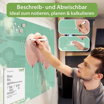 Auf der glatten Glasoberfläche lassen sich Termine, Rezepte oder Notizen ganz einfach mit Kreidestiften festhalten und rückstandslos entfernen. Starke Neodym-Magnete halten Ihre wichtigsten Erinnerungen sicher an Ort und Stelle. So entsteht Ihre ganz persönliche Ideenwand - jeden Tag neu.