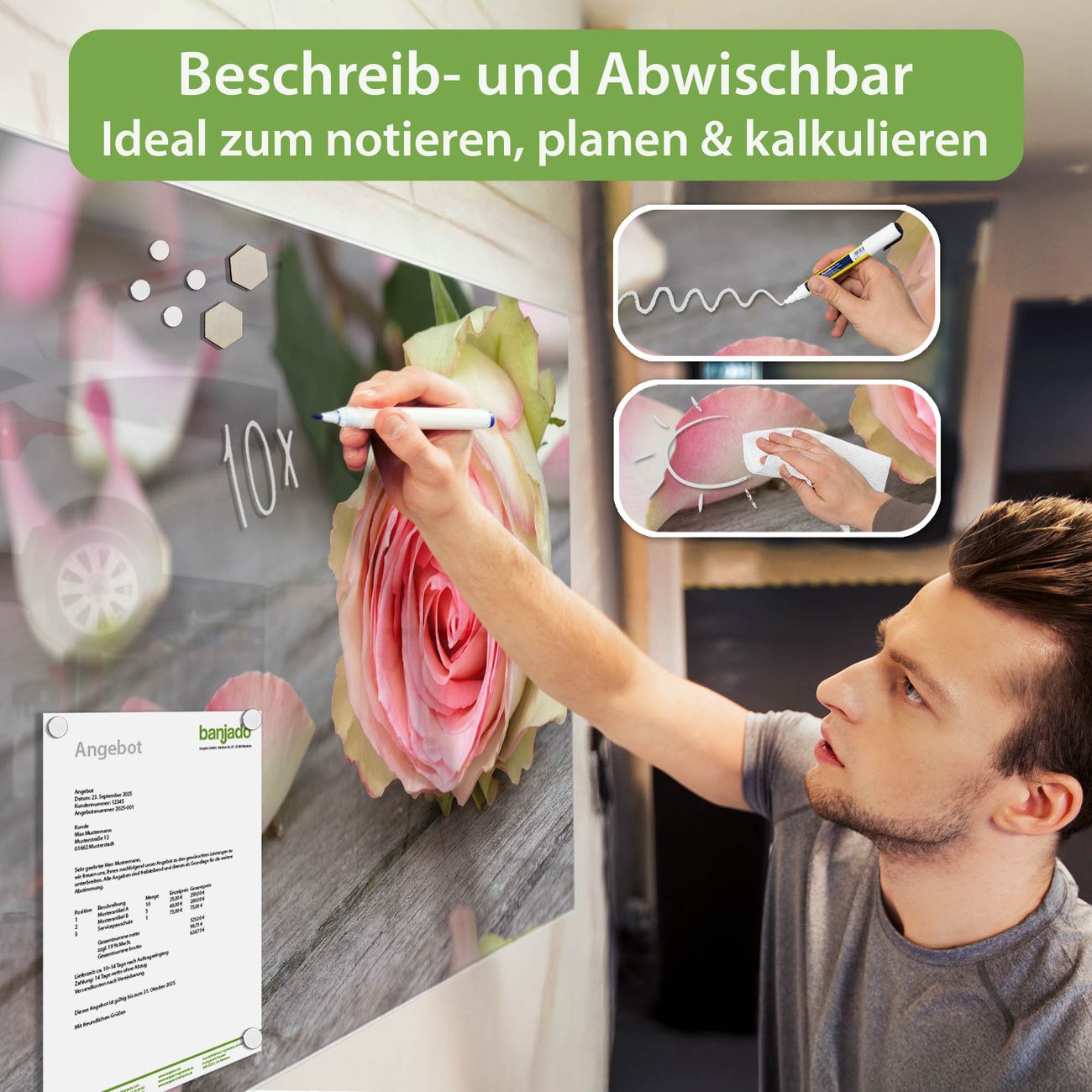Material: 4mm Sicherheitsglas mit Metallrückwand Eigenschaften: beschreibbar, magnetisch, kratzfest Maße: 75x50x0,6cm, 5,63kg schwer Motiv Nummer 10231 Rosa Rose Zubehör: inklusive 4 Neodym-Magnete