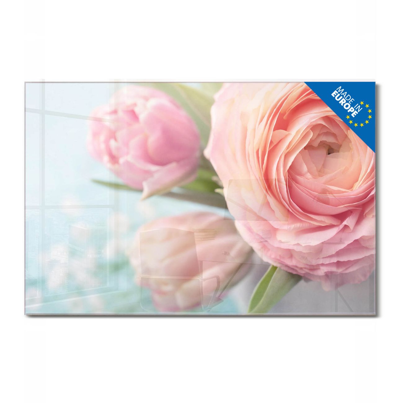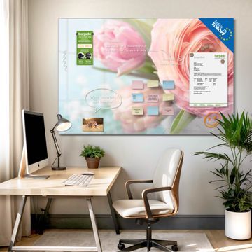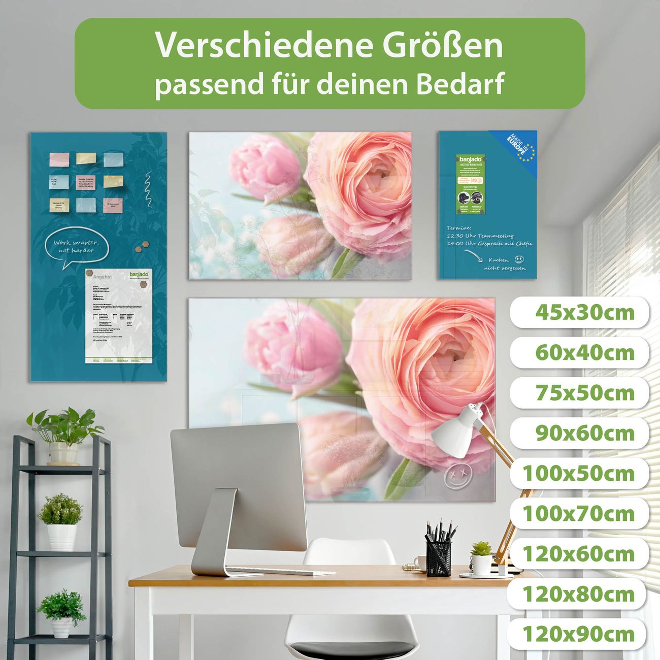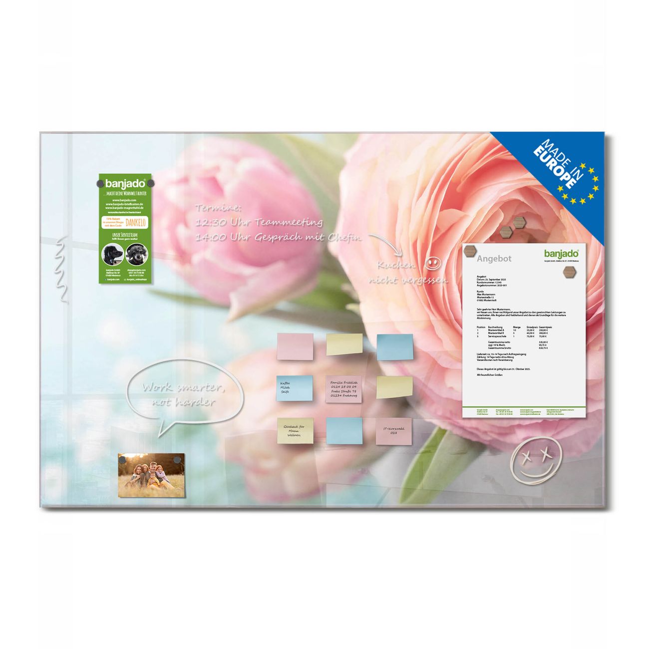 Material: 4mm Sicherheitsglas mit Metallrückwand Eigenschaften: beschreibbar, magnetisch, kratzfest Maße: 120x80x0,6cm, 14,40kg schwer Motiv Nummer 10435 Rosa Tulpe Zubehör: inklusive 4 Neodym-Magnete