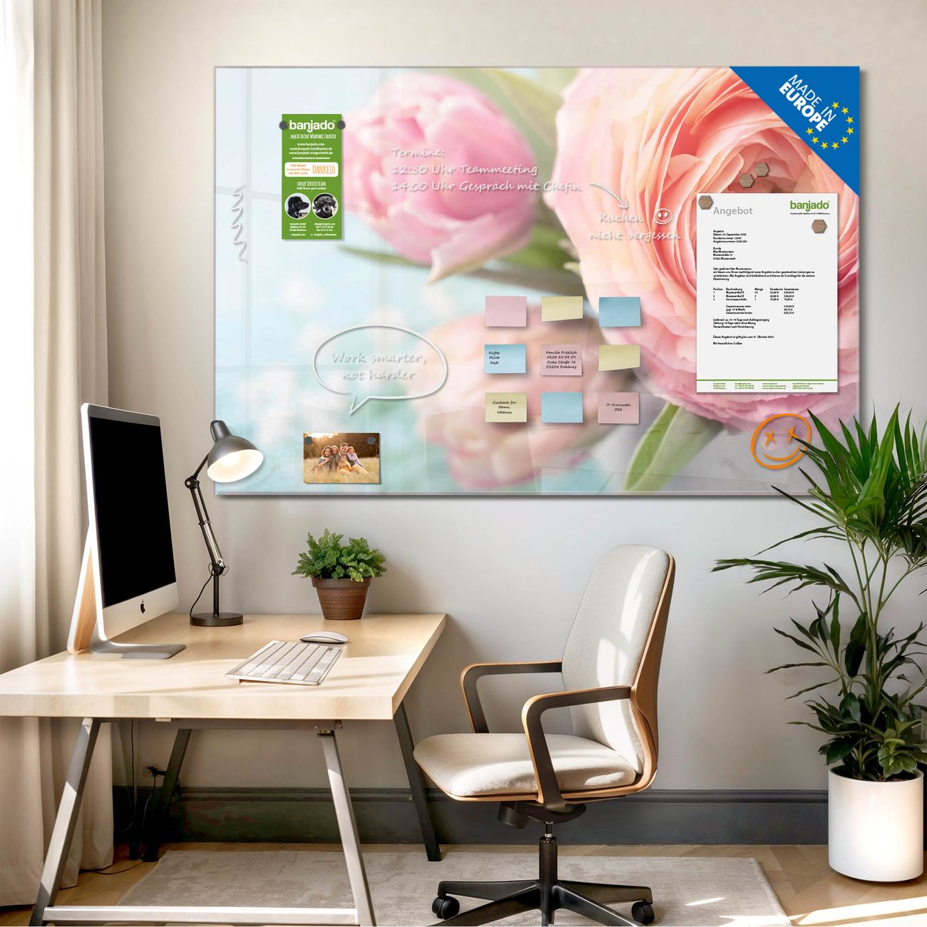 Die banjado Glas Magnettafel mit dem Motiv Motiv Rosa Tulpe verbindet Funktionalität mit Stil. Sie ersetzt das Zettelchaos durch klare Strukturen und bringt dabei eine warme, natürliche Atmosphäre in Ihr Zuhause. Ob im Büro, in der Küche oder im Eingangsbereich - dieses Design-Board zieht Blicke an und sorgt für Ordnung mit Charakter.