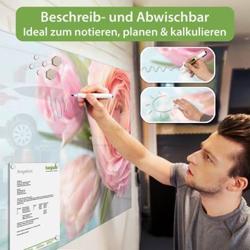 Auf der glatten Glasoberfläche lassen sich Termine, Rezepte oder Notizen ganz einfach mit Kreidestiften festhalten und rückstandslos entfernen. Starke Neodym-Magnete halten Ihre wichtigsten Erinnerungen sicher an Ort und Stelle. So entsteht Ihre ganz persönliche Ideenwand - jeden Tag neu.