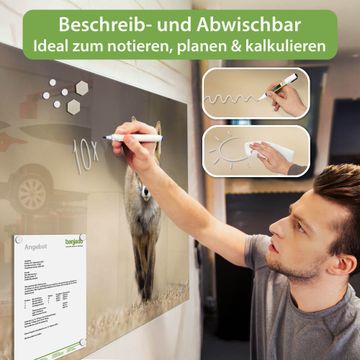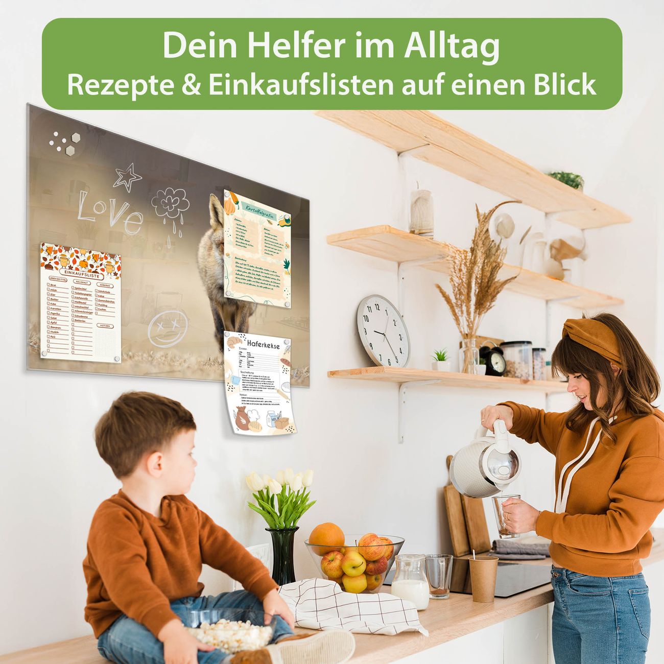 Auf der glatten Glasoberfläche lassen sich Termine, Rezepte oder Notizen ganz einfach mit Kreidestiften festhalten und rückstandslos entfernen. Starke Neodym-Magnete halten Ihre wichtigsten Erinnerungen sicher an Ort und Stelle. So entsteht Ihre ganz persönliche Ideenwand - jeden Tag neu.
