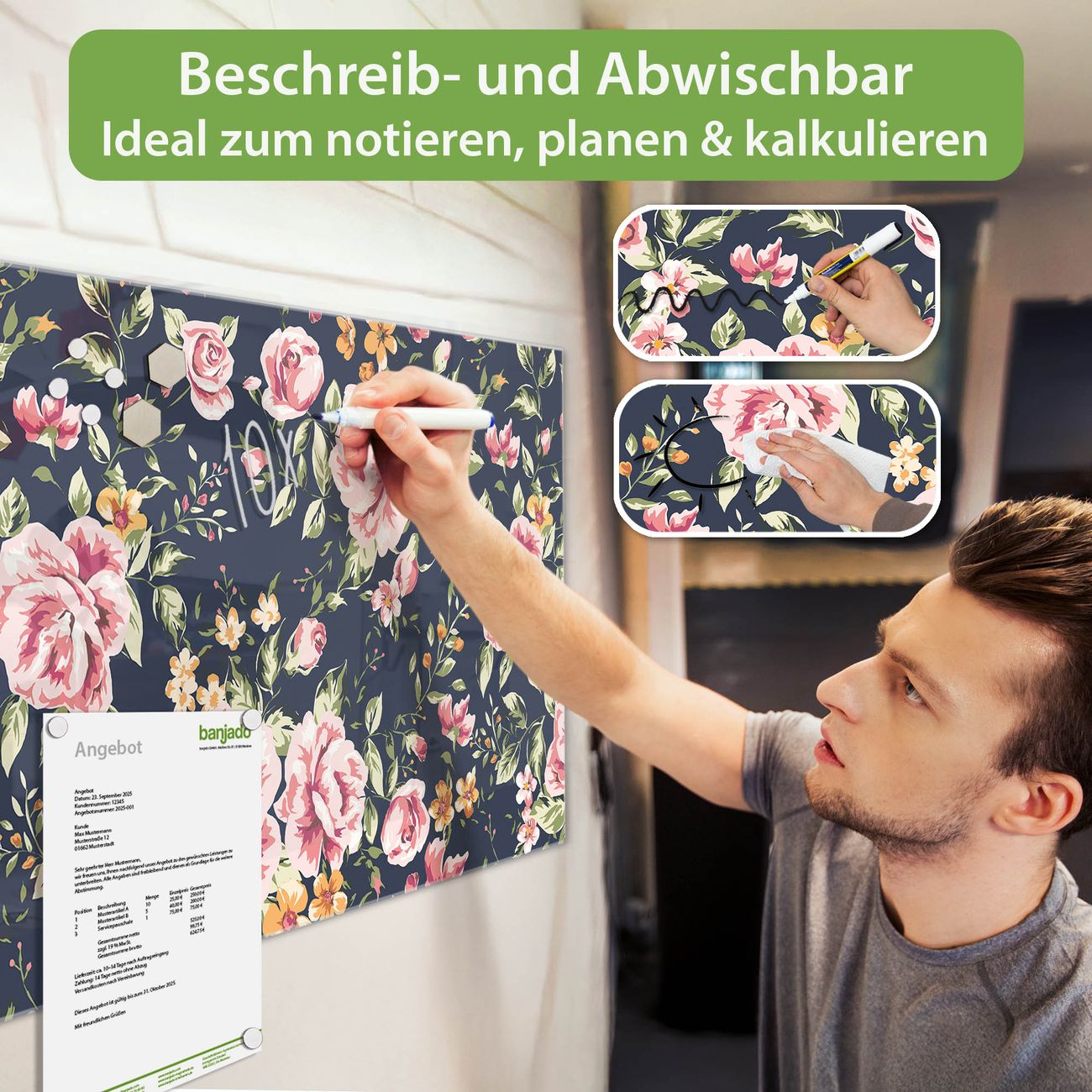 Die banjado Glas Magnettafel mit dem Motiv Motiv Rosen Auf Anthrazit verbindet Funktionalität mit Stil. Sie ersetzt das Zettelchaos durch klare Strukturen und bringt dabei eine warme, natürliche Atmosphäre in Ihr Zuhause. Ob im Büro, in der Küche oder im Eingangsbereich - dieses Design-Board zieht Blicke an und sorgt für Ordnung mit Charakter.