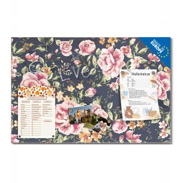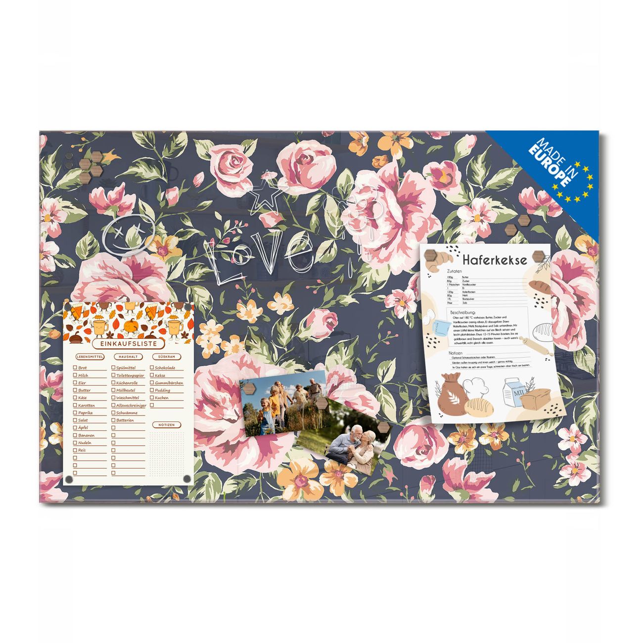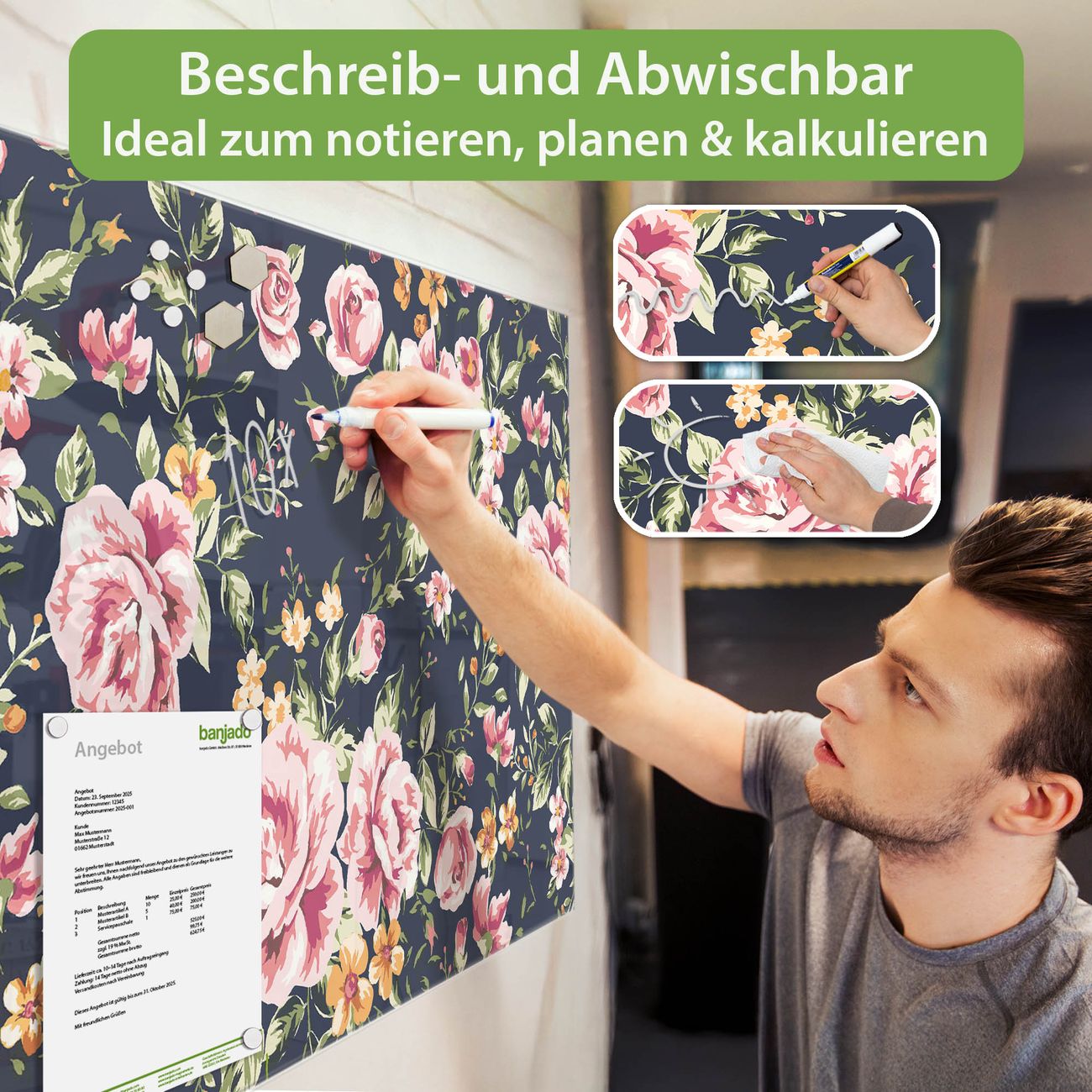 Material: 4mm Sicherheitsglas mit Metallrückwand Eigenschaften: beschreibbar, magnetisch, kratzfest Maße: 45x30x0,6cm, 2,03kg schwer Motiv Nummer 11219 Rosen Auf Anthrazit Zubehör: inklusive 4 Neodym-Magnete