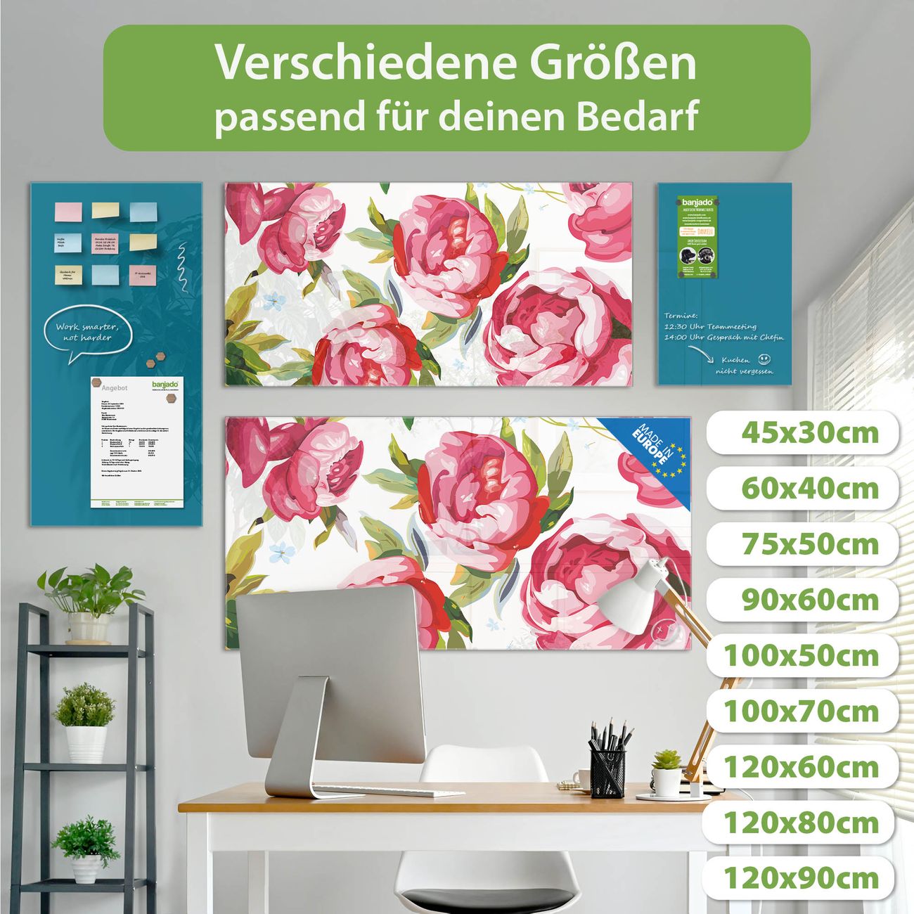 Material: 4mm Sicherheitsglas mit Metallrückwand Eigenschaften: beschreibbar, magnetisch, kratzfest Maße: 120x60x0,6cm, 10,80kg schwer Motiv Nummer 10421 Rosen Rustikal Zubehör: inklusive 4 Neodym-Magnete