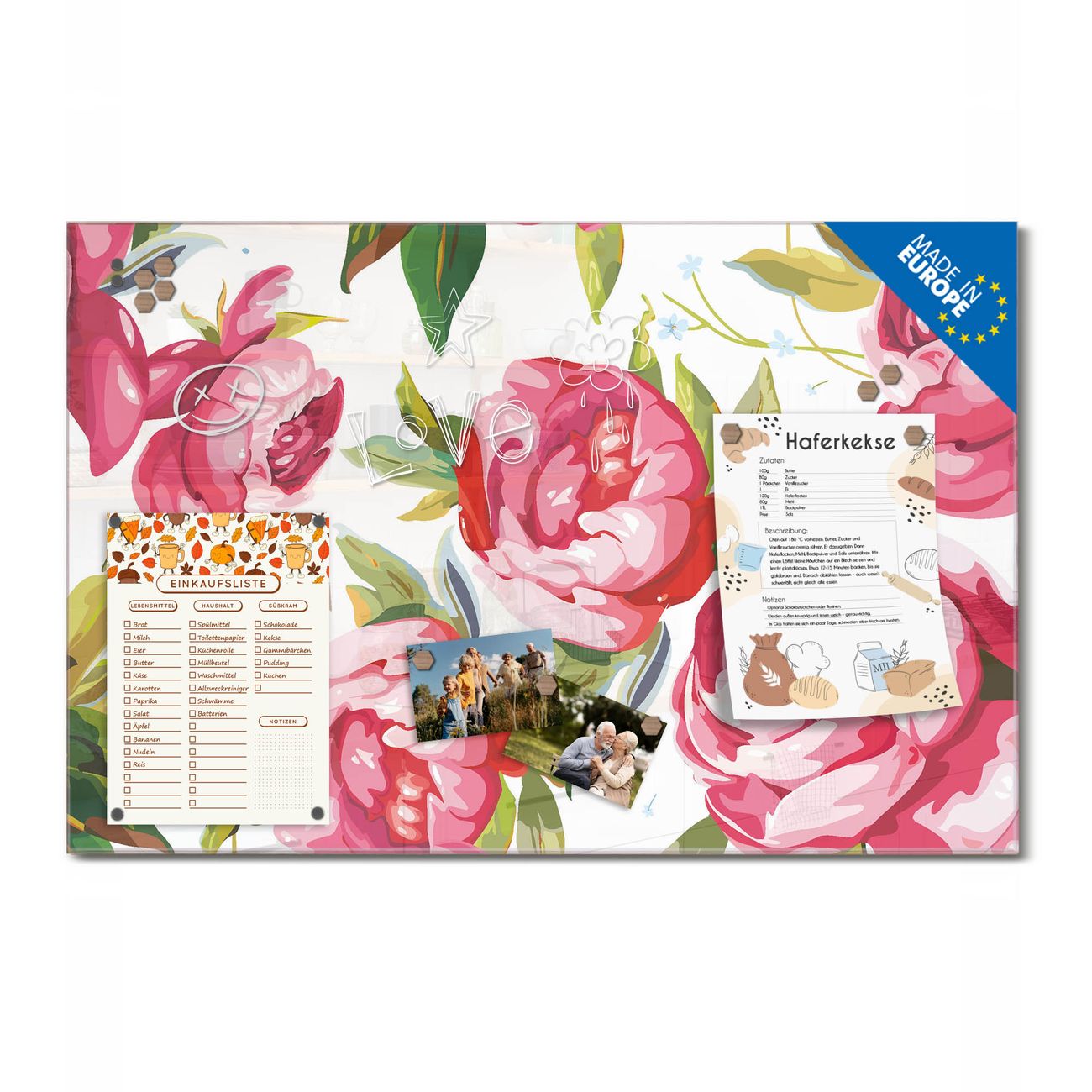 Material: 4mm Sicherheitsglas mit Metallrückwand Eigenschaften: beschreibbar, magnetisch, kratzfest Maße: 60x40x0,6cm, 3,6kg schwer Motiv Nummer 10421 Rosen Rustikal Zubehör: inklusive 4 Neodym-Magnete