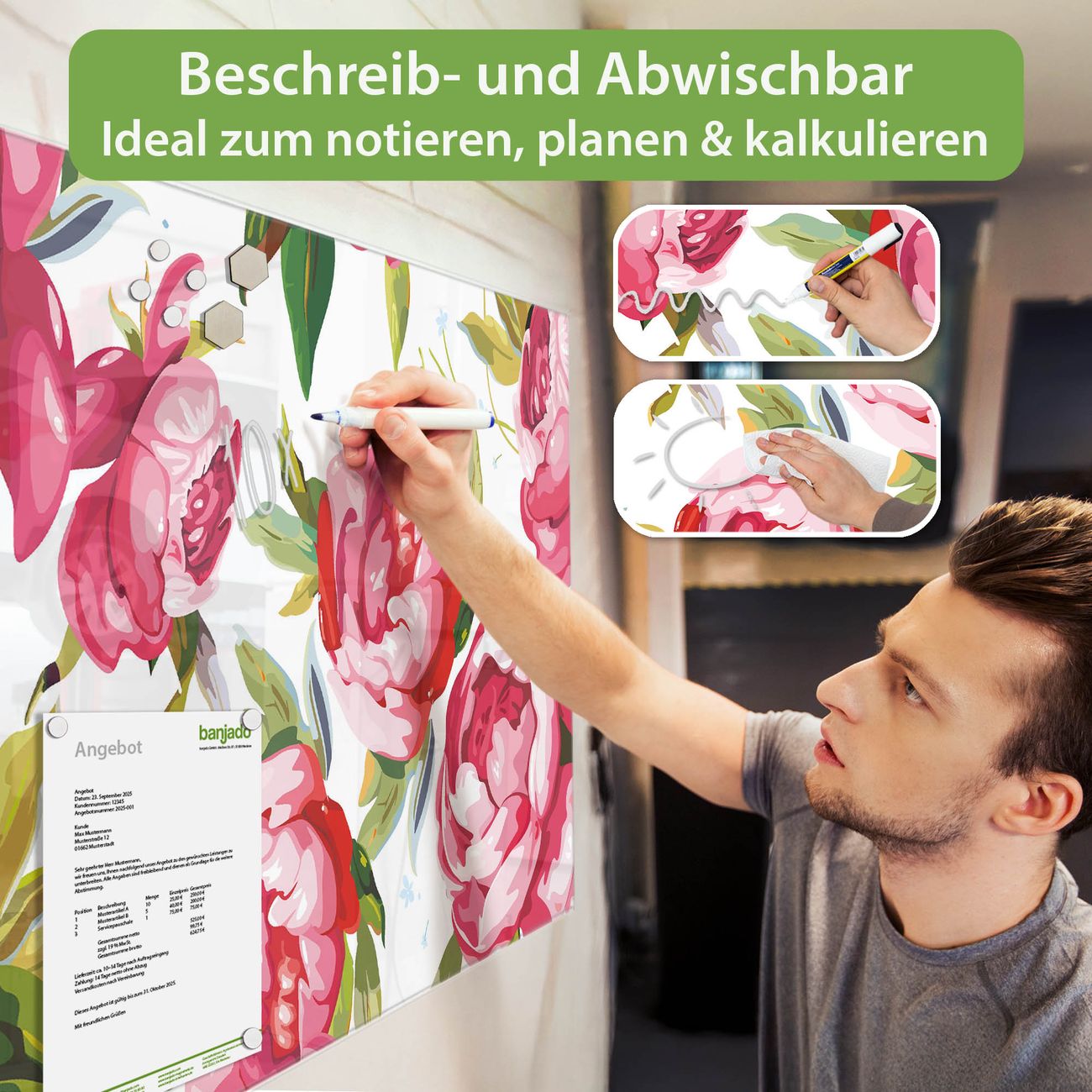 Jede Glas Magnettafel wird in unserer Werkstatt von Hand gefertigt und sorgfältig geprüft. So erhalten Sie ein echtes Qualitätsprodukt, das Funktion und Ästhetik perfekt vereint.?? Warum banjado?