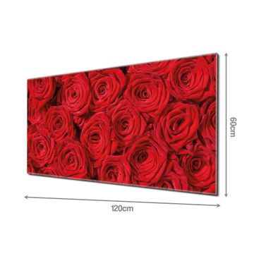 Material: 4mm Sicherheitsglas mit Metallrückwand Eigenschaften: beschreibbar, magnetisch, kratzfest Maße: 120x60x0,6cm, 10,80kg schwer Motiv Nummer 10107 Rosenbett Zubehör: inklusive 4 Neodym-Magnete
