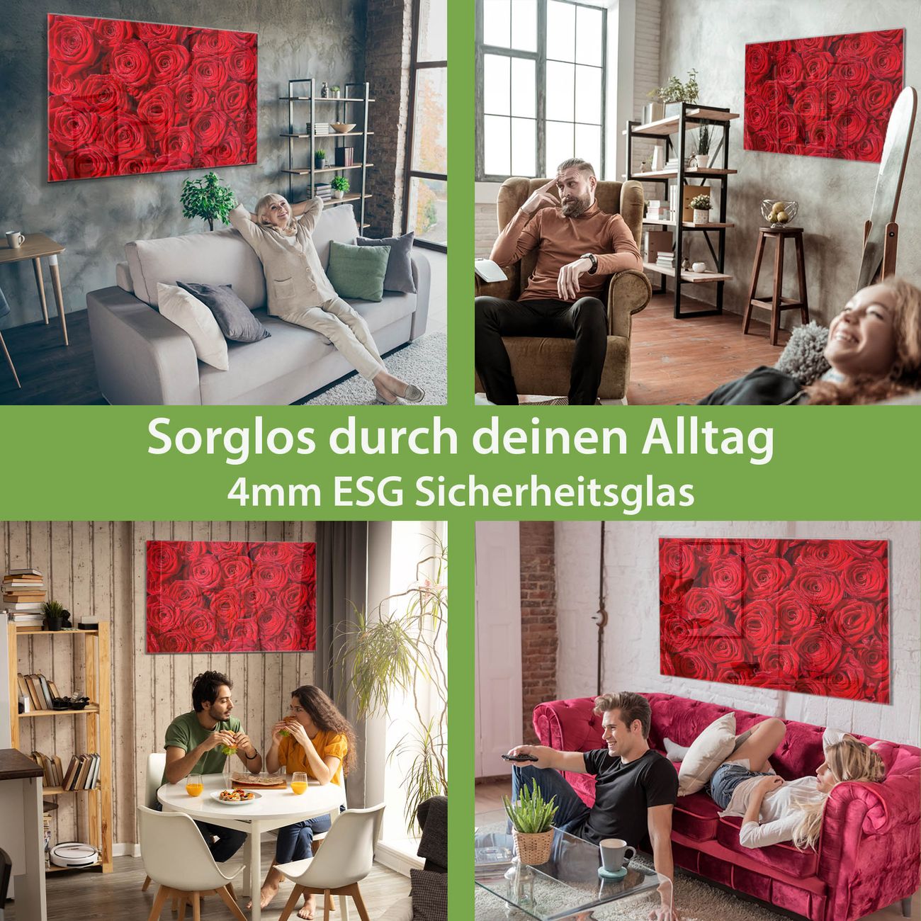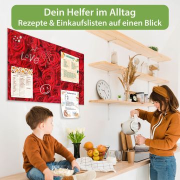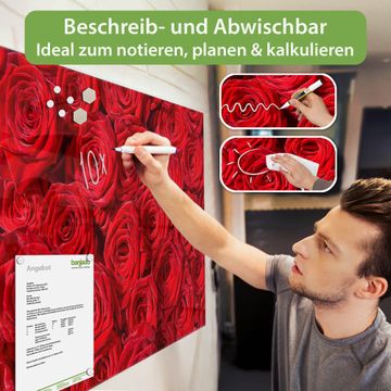 Material: 4mm Sicherheitsglas mit Metallrückwand Eigenschaften: beschreibbar, magnetisch, kratzfest Maße: 75x50x0,6cm, 5,63kg schwer Motiv Nummer 10107 Rosenbett Zubehör: inklusive 4 Neodym-Magnete
