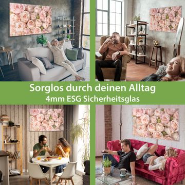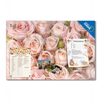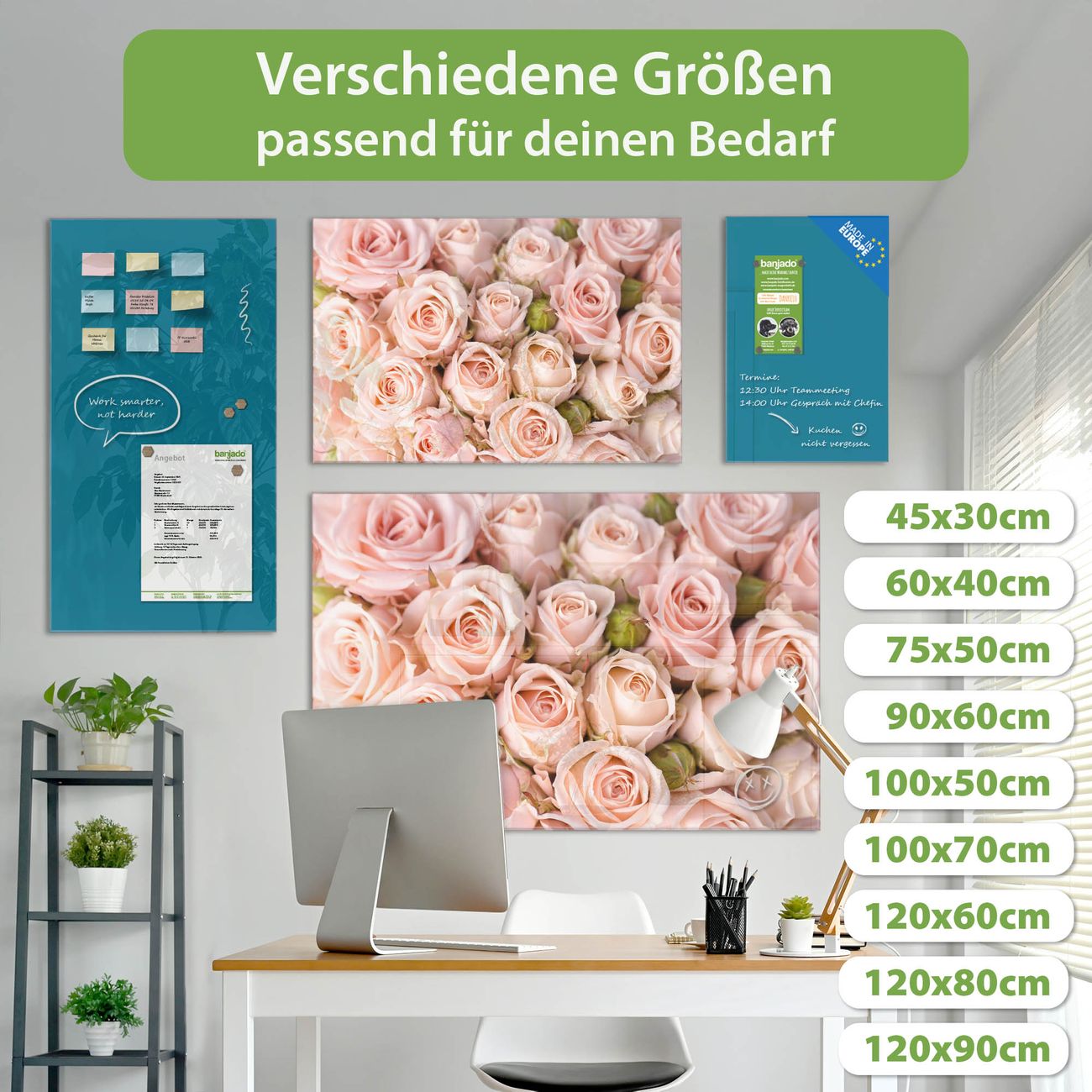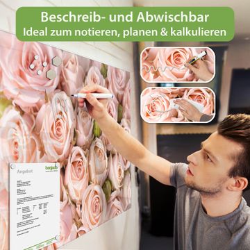 Material: 4mm Sicherheitsglas mit Metallrückwand Eigenschaften: beschreibbar, magnetisch, kratzfest Maße: 45x30x0,6cm, 2,03kg schwer Motiv Nummer 11213 Rosenbouquet Zubehör: inklusive 4 Neodym-Magnete