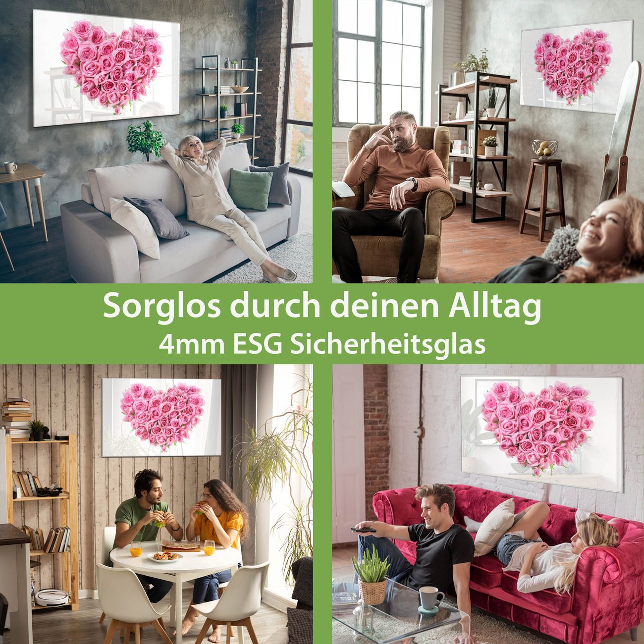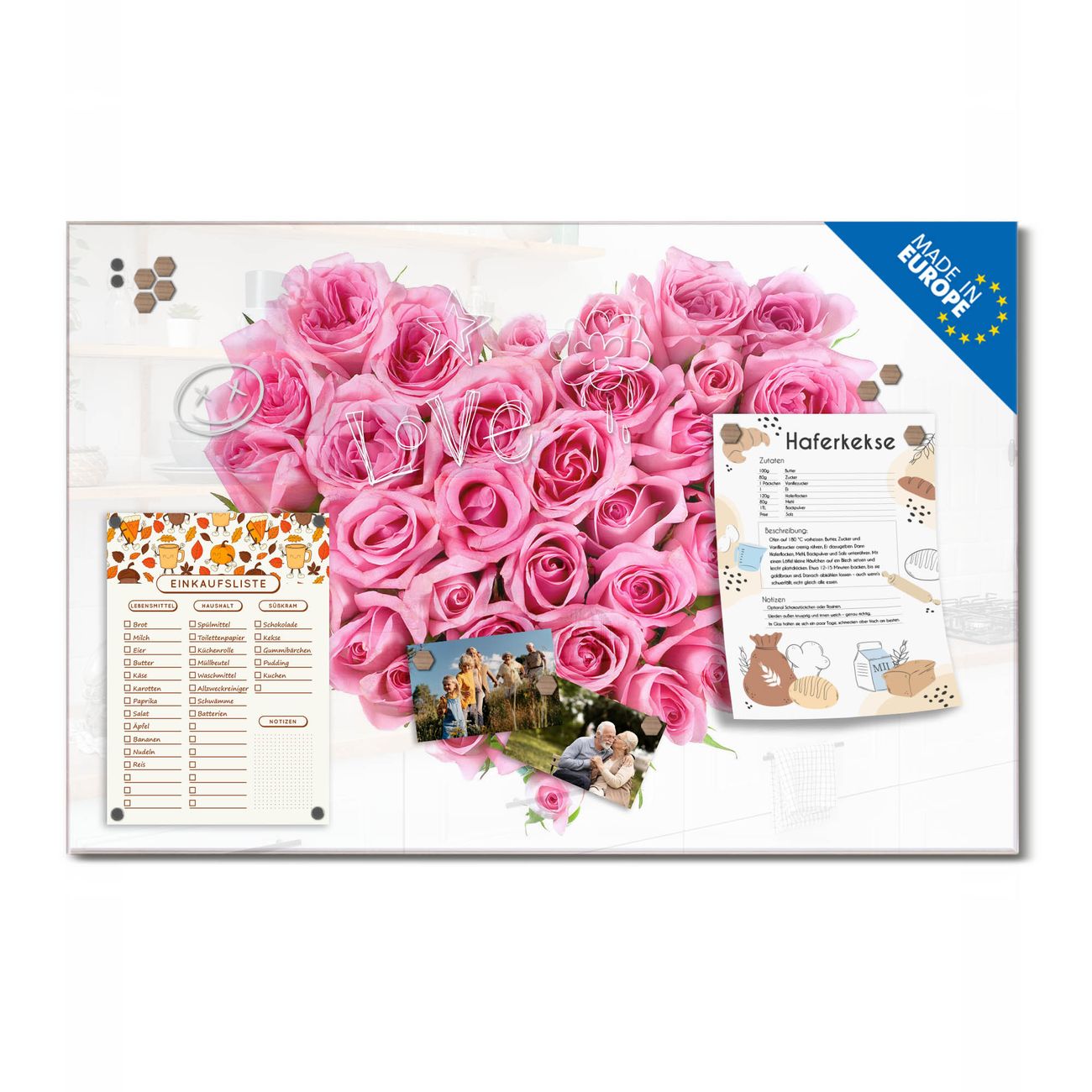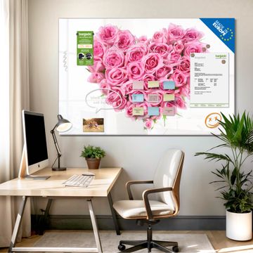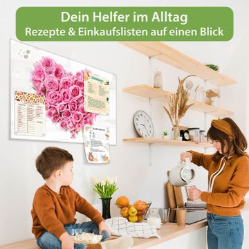 Material: 4mm Sicherheitsglas mit Metallrückwand Eigenschaften: beschreibbar, magnetisch, kratzfest Maße: 75x50x0,6cm, 5,63kg schwer Motiv Nummer 10059 Rosenherz Zubehör: inklusive 4 Neodym-Magnete