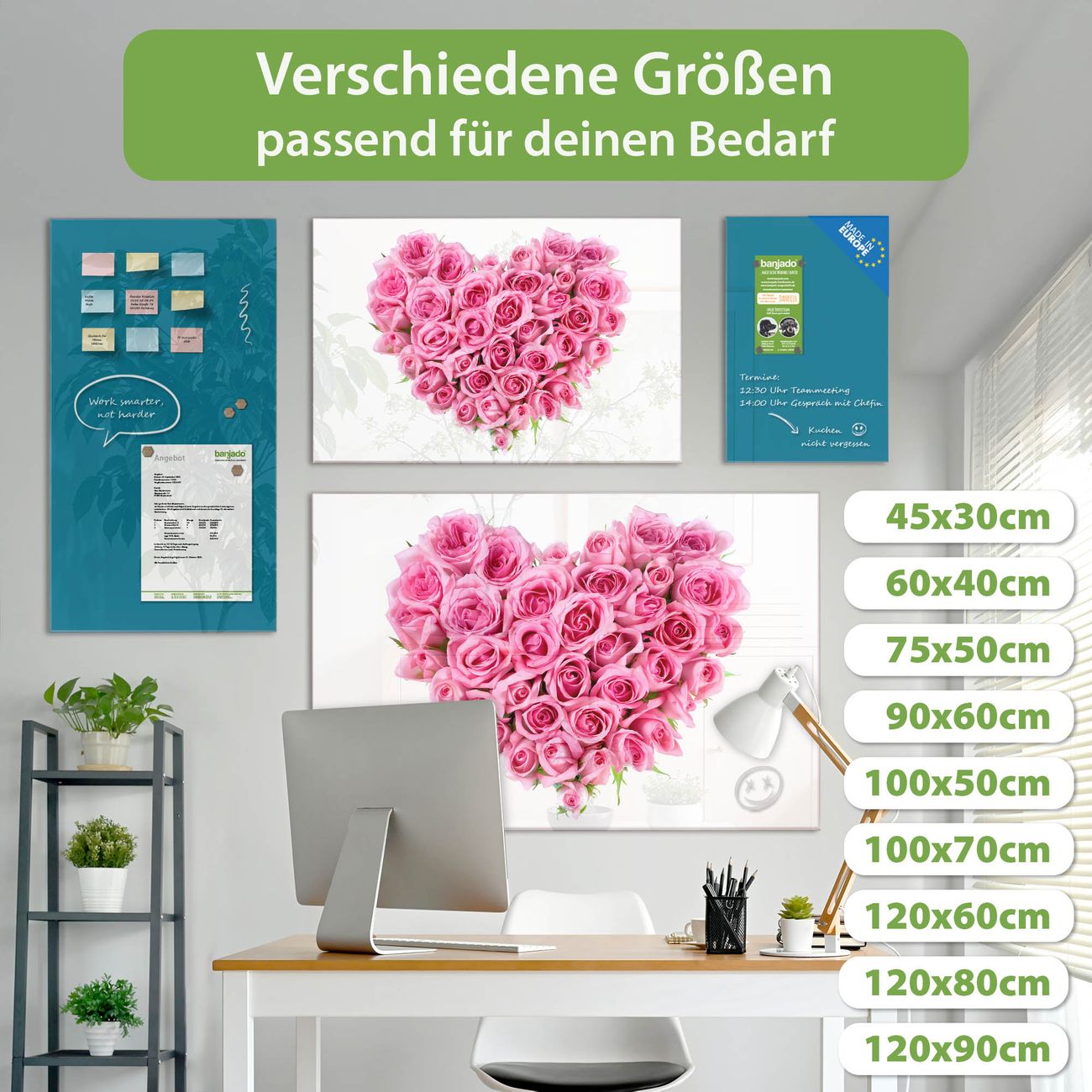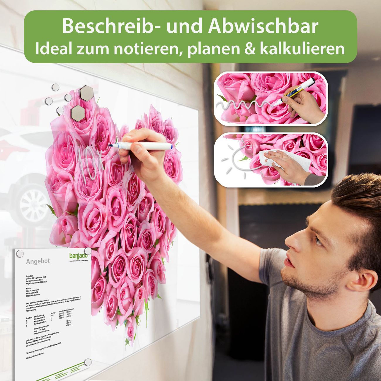 Jede Glas Magnettafel wird in unserer Werkstatt von Hand gefertigt und sorgfältig geprüft. So erhalten Sie ein echtes Qualitätsprodukt, das Funktion und Ästhetik perfekt vereint.?? Warum banjado?