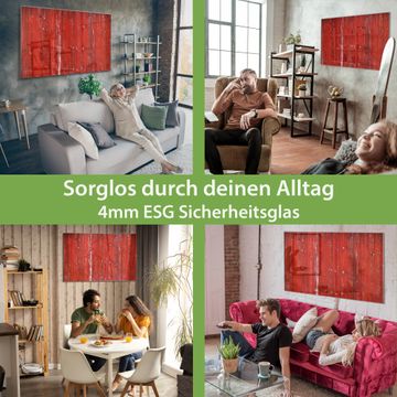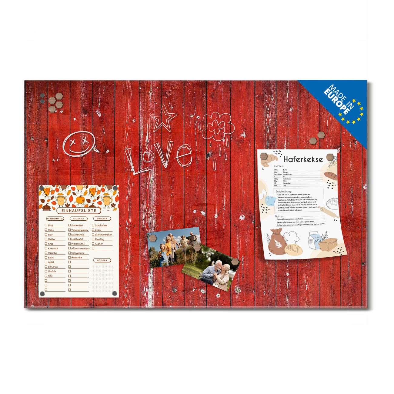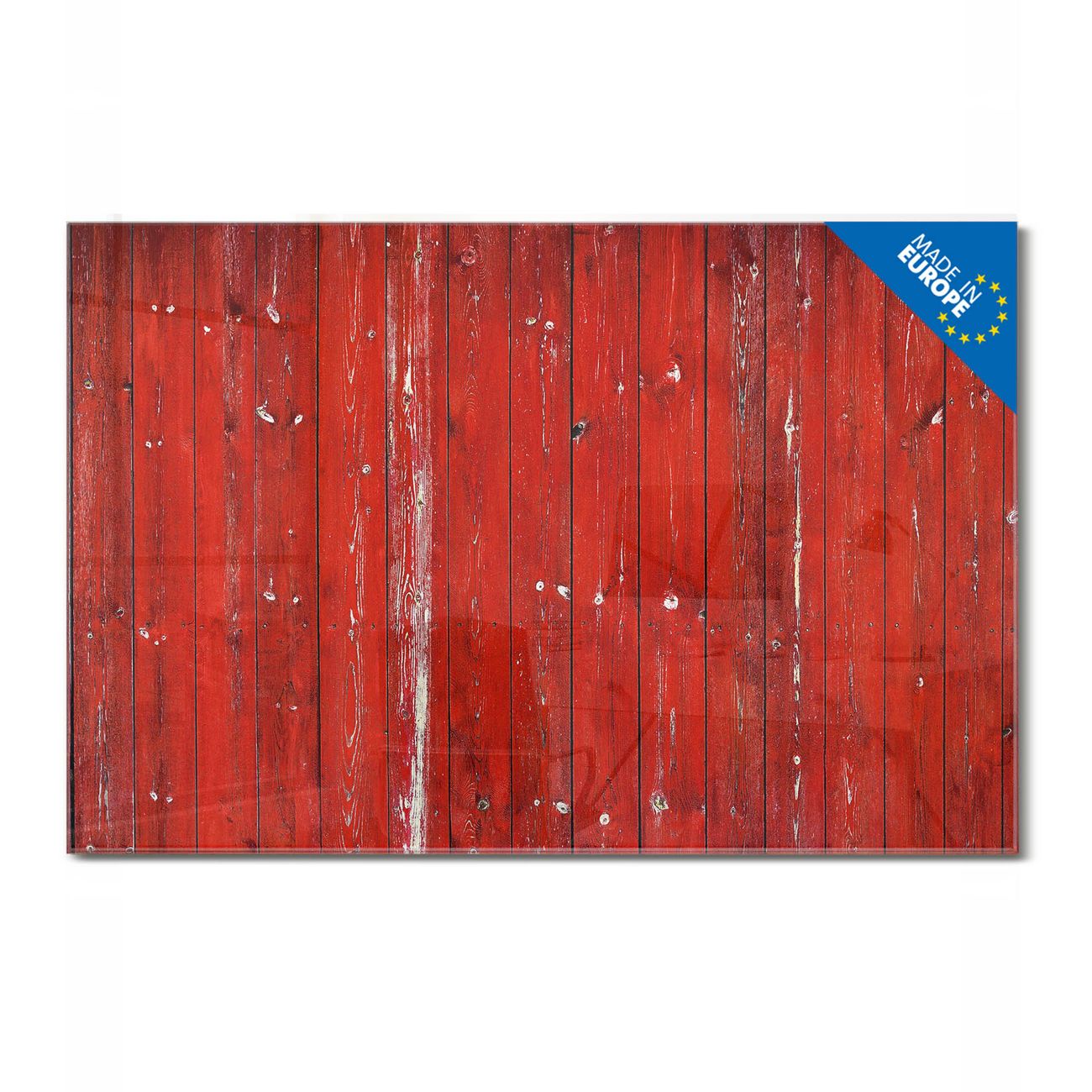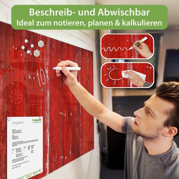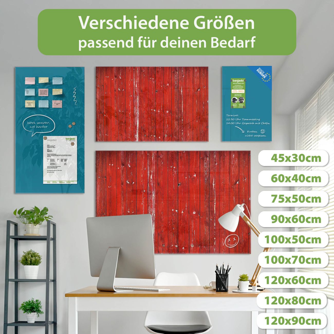 Material: 4mm Sicherheitsglas mit Metallrückwand Eigenschaften: beschreibbar, magnetisch, kratzfest Maße: 75x50x0,6cm, 5,63kg schwer Motiv Nummer 10748 Rote Holzlatten Zubehör: inklusive 4 Neodym-Magnete