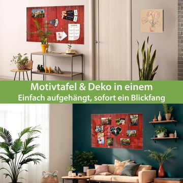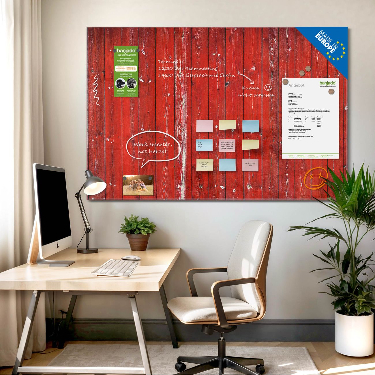 Ein Stück Design, das Ihren Alltag organisiert. Schreiben, heften, inspirieren - alles an einem Ort. Qualität, die man spürt. Montage leicht gemacht. Handwerk mit Herz - veredelt in Sachsen. Einzigartiges Design mit Motiv Motiv Rote Holzlatten Beschreibbare Glasoberfläche, leicht zu reinigen Starke Magnetkraft durch Stahlrückwand Inklusive 4 Neodym-Magneten Flexible Montageoptionen Handveredelt in Sachsen - Qualität, die bleibt