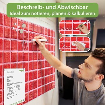 Material: 4mm Sicherheitsglas mit Metallrückwand Eigenschaften: beschreibbar, magnetisch, kratzfest Maße: 120x60x0,6cm, 10,80kg schwer Motiv Nummer 11359 Rote Kacheln Zubehör: inklusive 4 Neodym-Magnete