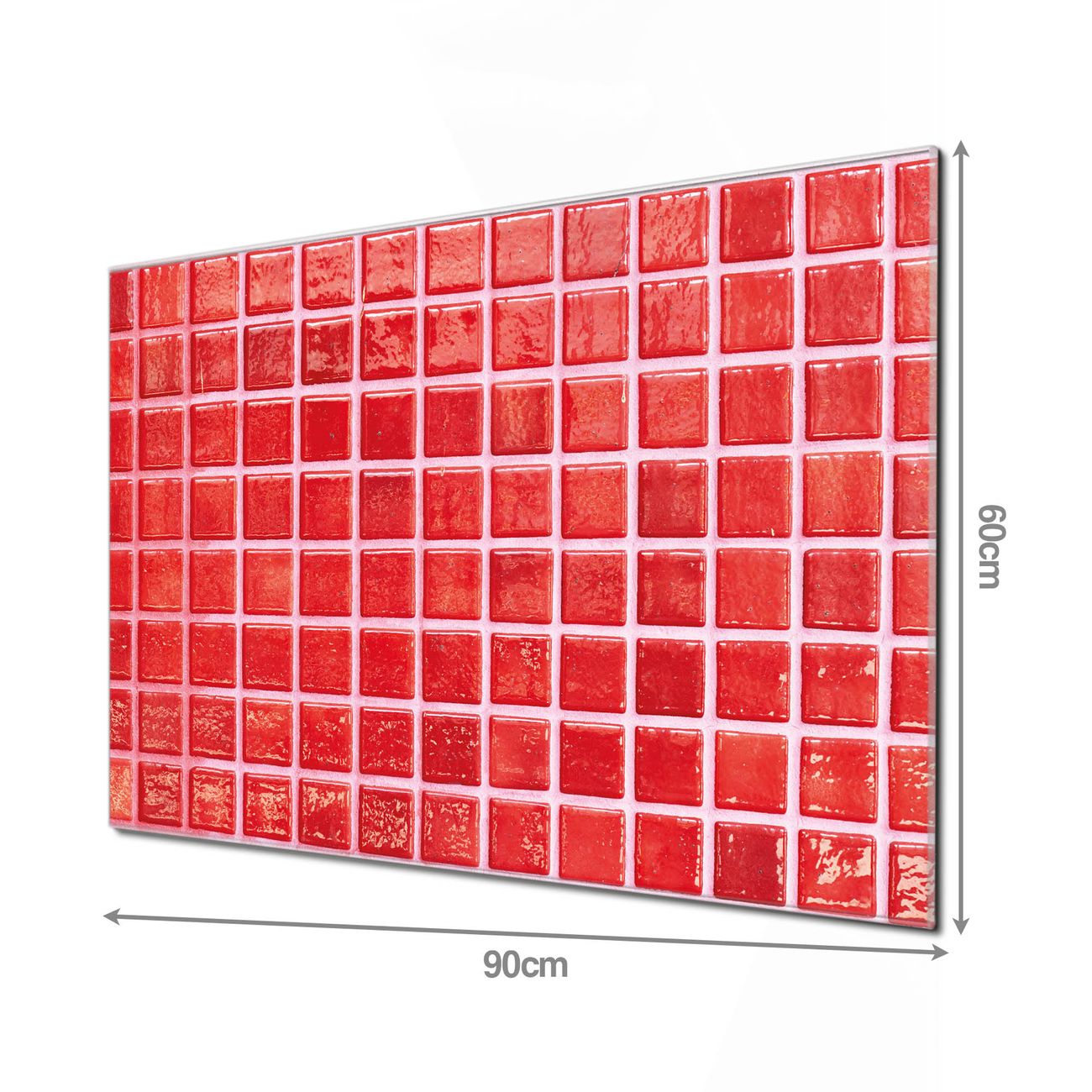 Material: 4mm Sicherheitsglas mit Metallrückwand Eigenschaften: beschreibbar, magnetisch, kratzfest Maße: 90x60x0,6cm, 8,10kg schwer Motiv Nummer 11359 Rote Kacheln Zubehör: inklusive 4 Neodym-Magnete