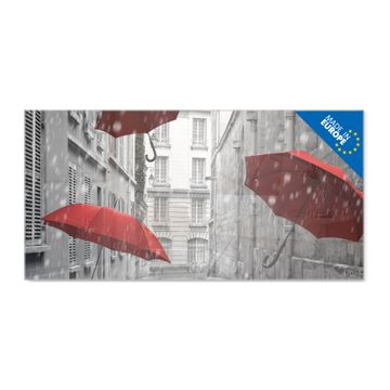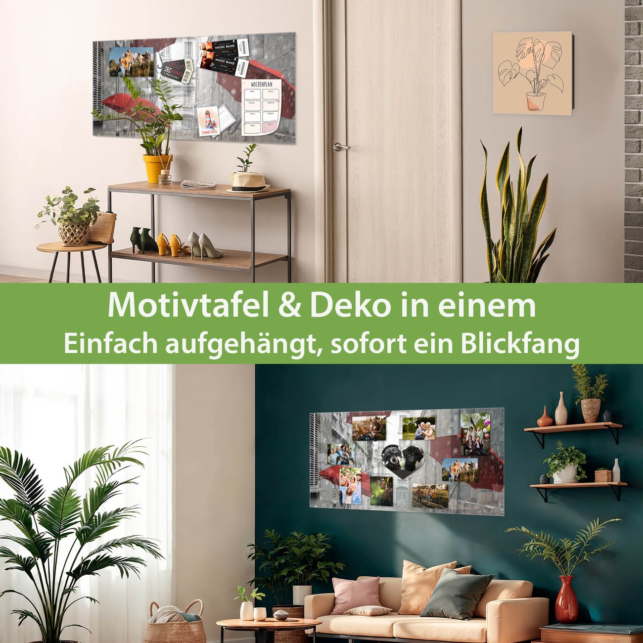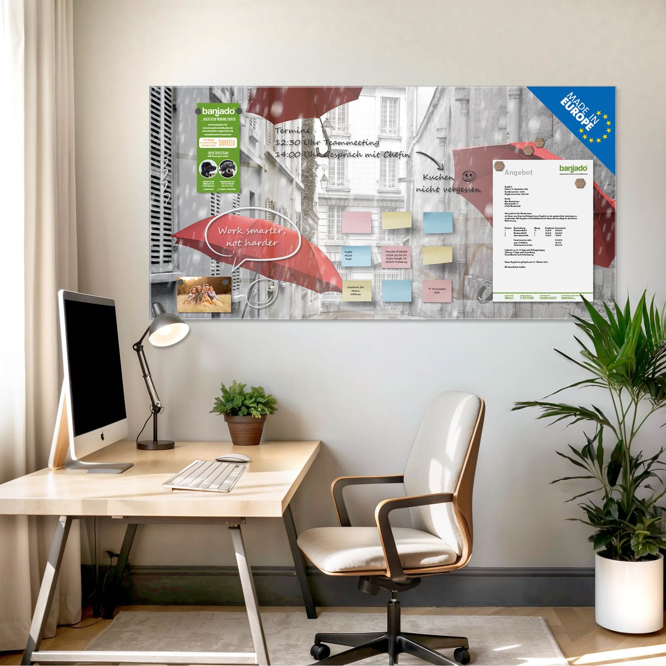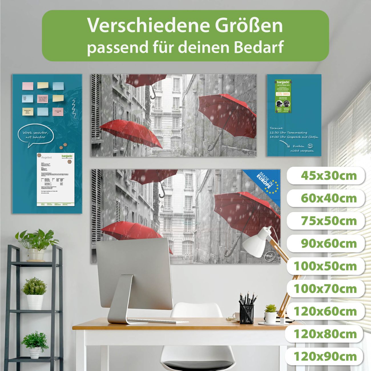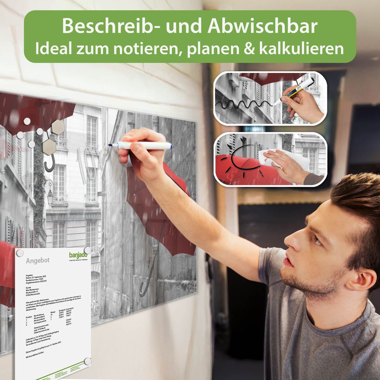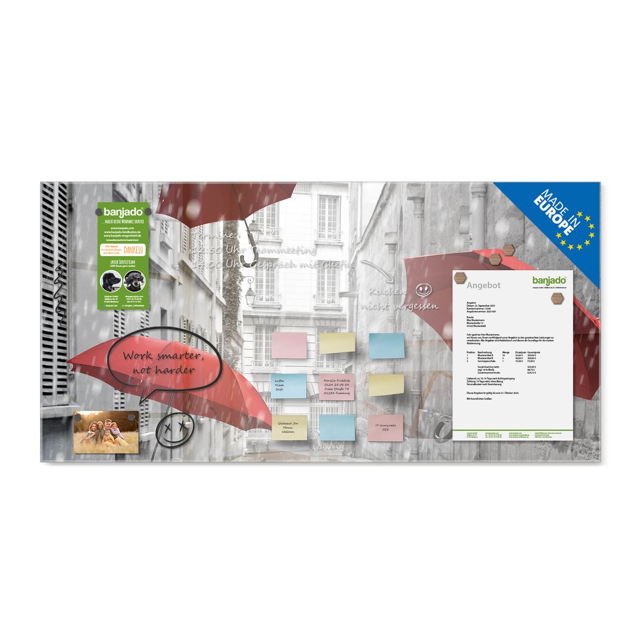 Material: 4mm Sicherheitsglas mit Metallrückwand Eigenschaften: beschreibbar, magnetisch, kratzfest Maße: 100x50x0,6cm, 7,50kg schwer Motiv Nummer 10866 Rote Schirme Zubehör: inklusive 4 Neodym-Magnete