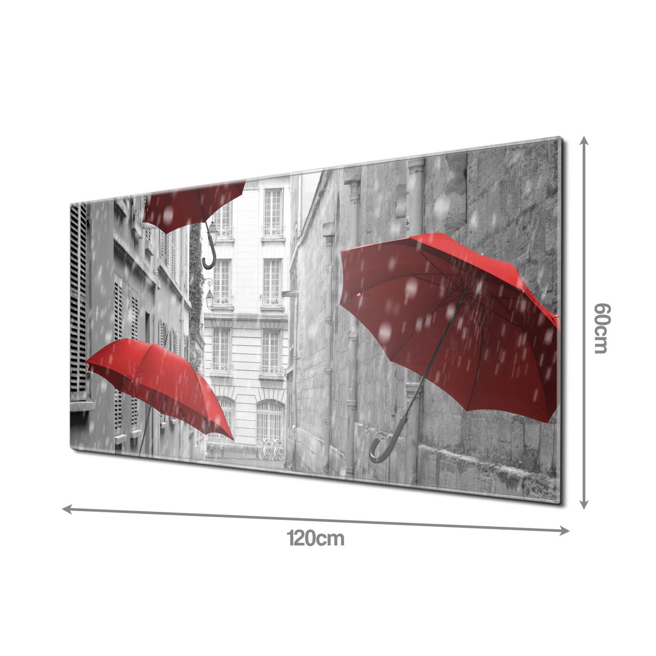 Material: 4mm Sicherheitsglas mit Metallrückwand Eigenschaften: beschreibbar, magnetisch, kratzfest Maße: 120x60x0,6cm, 10,80kg schwer Motiv Nummer 10866 Rote Schirme Zubehör: inklusive 4 Neodym-Magnete