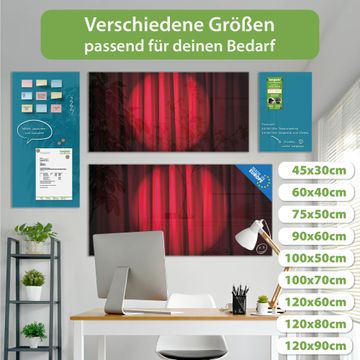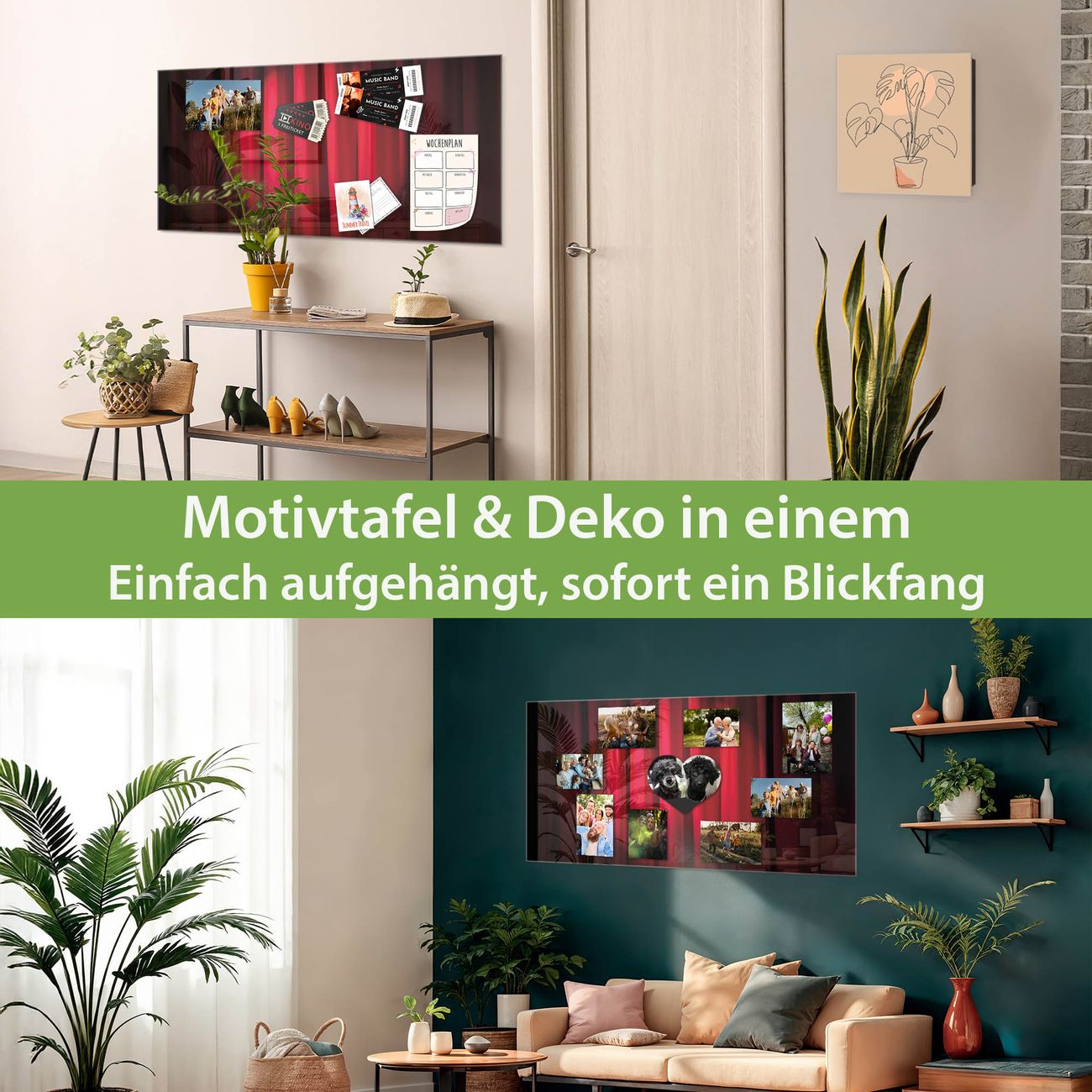 Material: 4mm Sicherheitsglas mit Metallrückwand Eigenschaften: beschreibbar, magnetisch, kratzfest Maße: 100x50x0,6cm, 7,50kg schwer Motiv Nummer 12445 Roter Vorhang Zubehör: inklusive 4 Neodym-Magnete