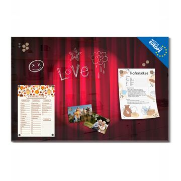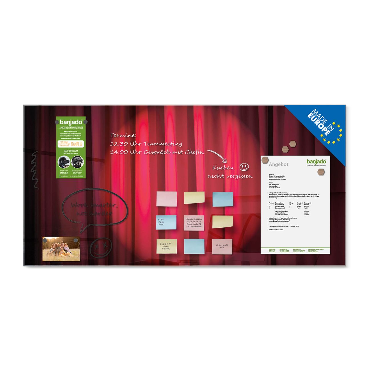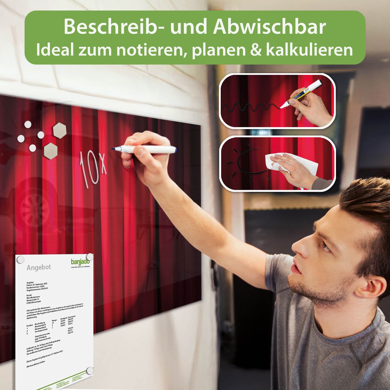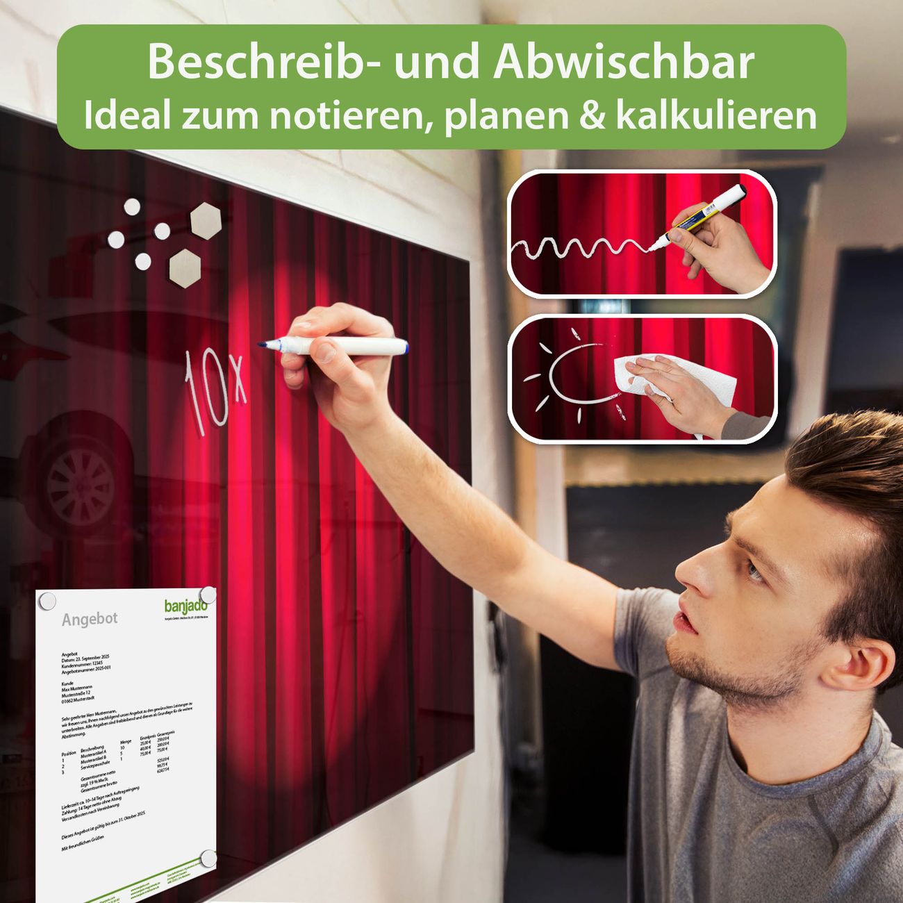 Material: 4mm Sicherheitsglas mit Metallrückwand Eigenschaften: beschreibbar, magnetisch, kratzfest Maße: 120x60x0,6cm, 10,80kg schwer Motiv Nummer 12445 Roter Vorhang Zubehör: inklusive 4 Neodym-Magnete