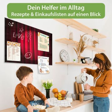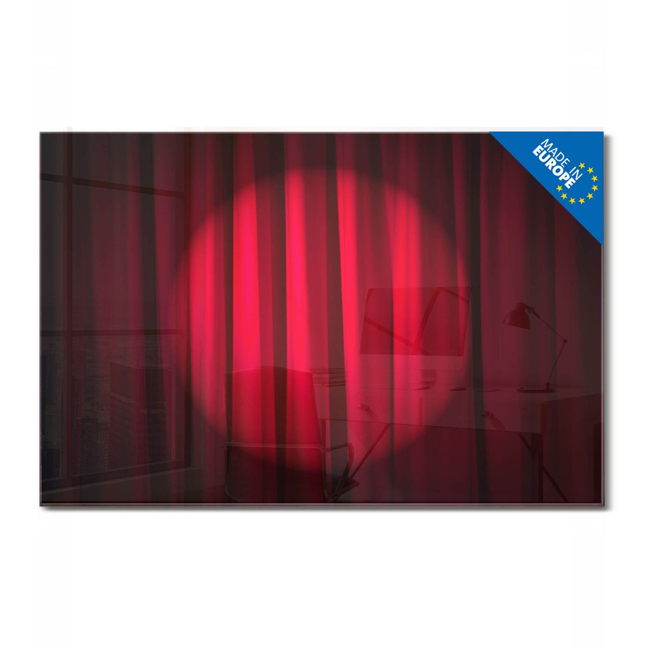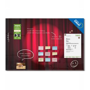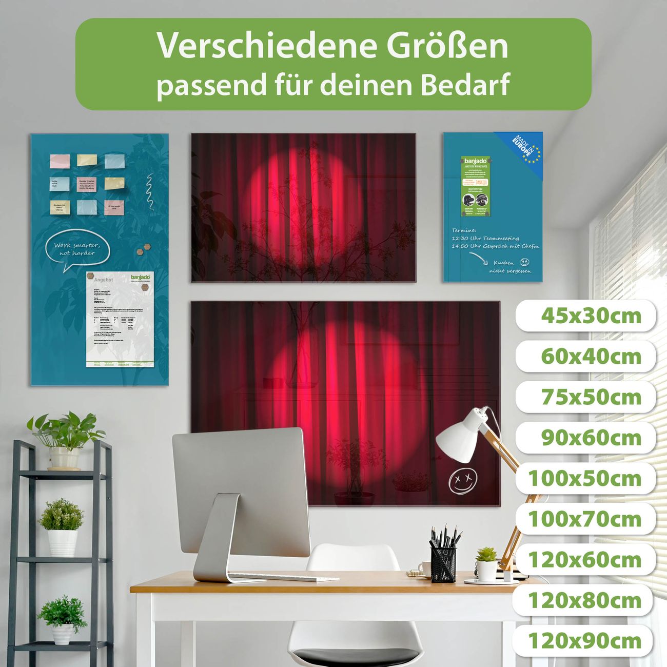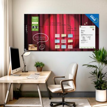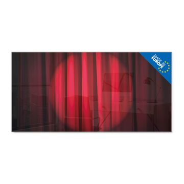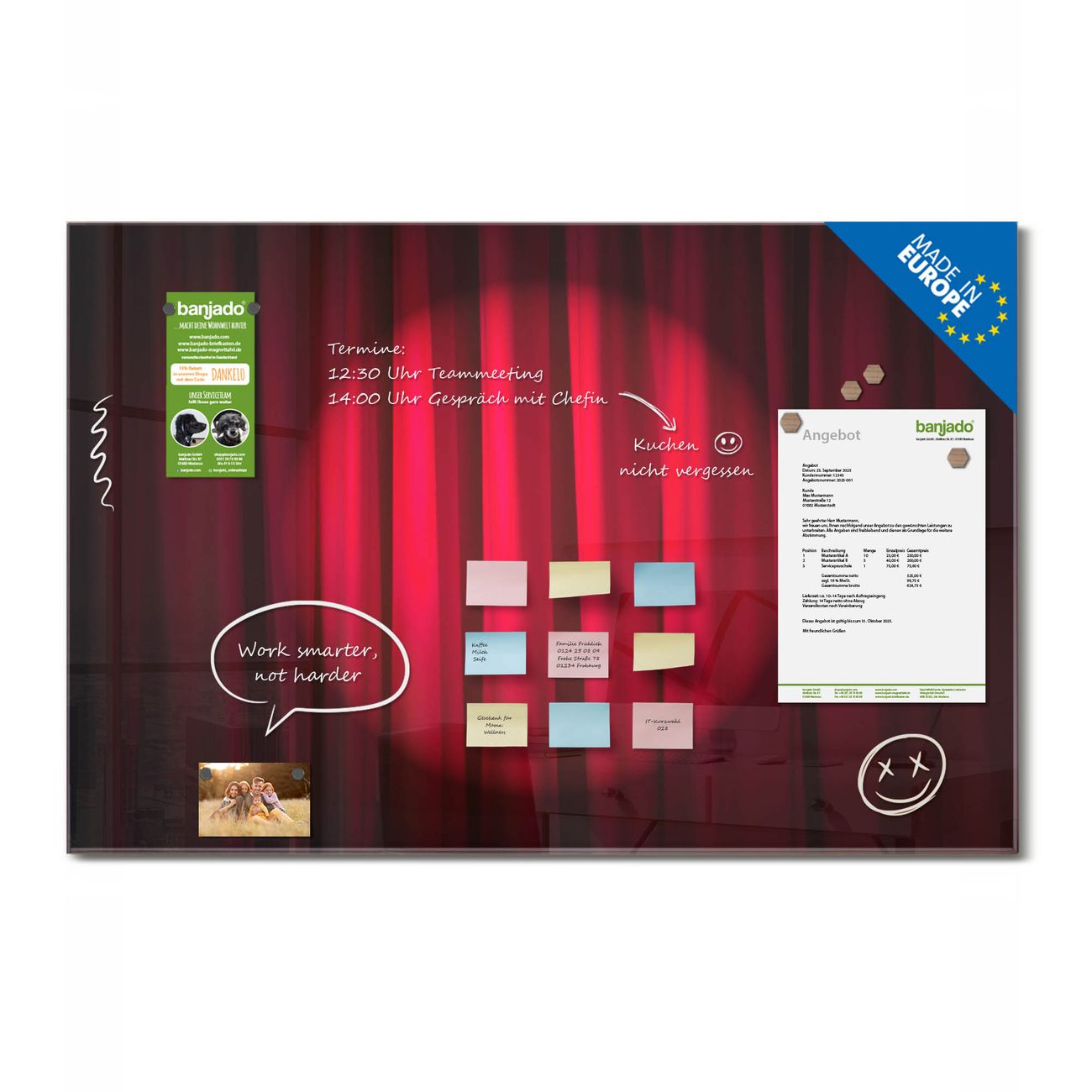 Material: 4mm Sicherheitsglas mit Metallrückwand Eigenschaften: beschreibbar, magnetisch, kratzfest Maße: 120x60x0,6cm, 10,80kg schwer Motiv Nummer 12445 Roter Vorhang Zubehör: inklusive 4 Neodym-Magnete