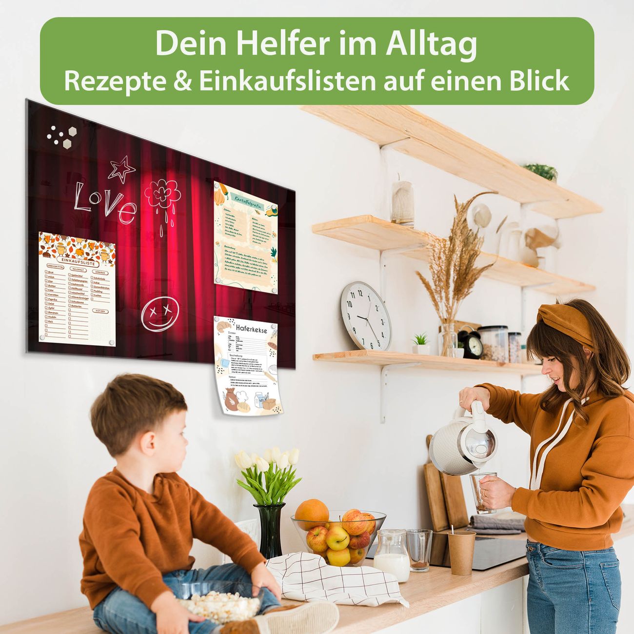 Ein Stück Design, das Ihren Alltag organisiert. Schreiben, heften, inspirieren - alles an einem Ort. Qualität, die man spürt. Montage leicht gemacht. Handwerk mit Herz - veredelt in Sachsen. Einzigartiges Design mit Motiv Motiv Roter Vorhang Beschreibbare Glasoberfläche, leicht zu reinigen Starke Magnetkraft durch Stahlrückwand Inklusive 4 Neodym-Magneten Flexible Montageoptionen Handveredelt in Sachsen - Qualität, die bleibt