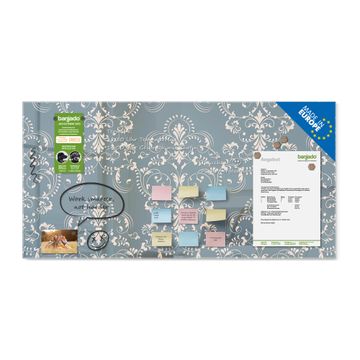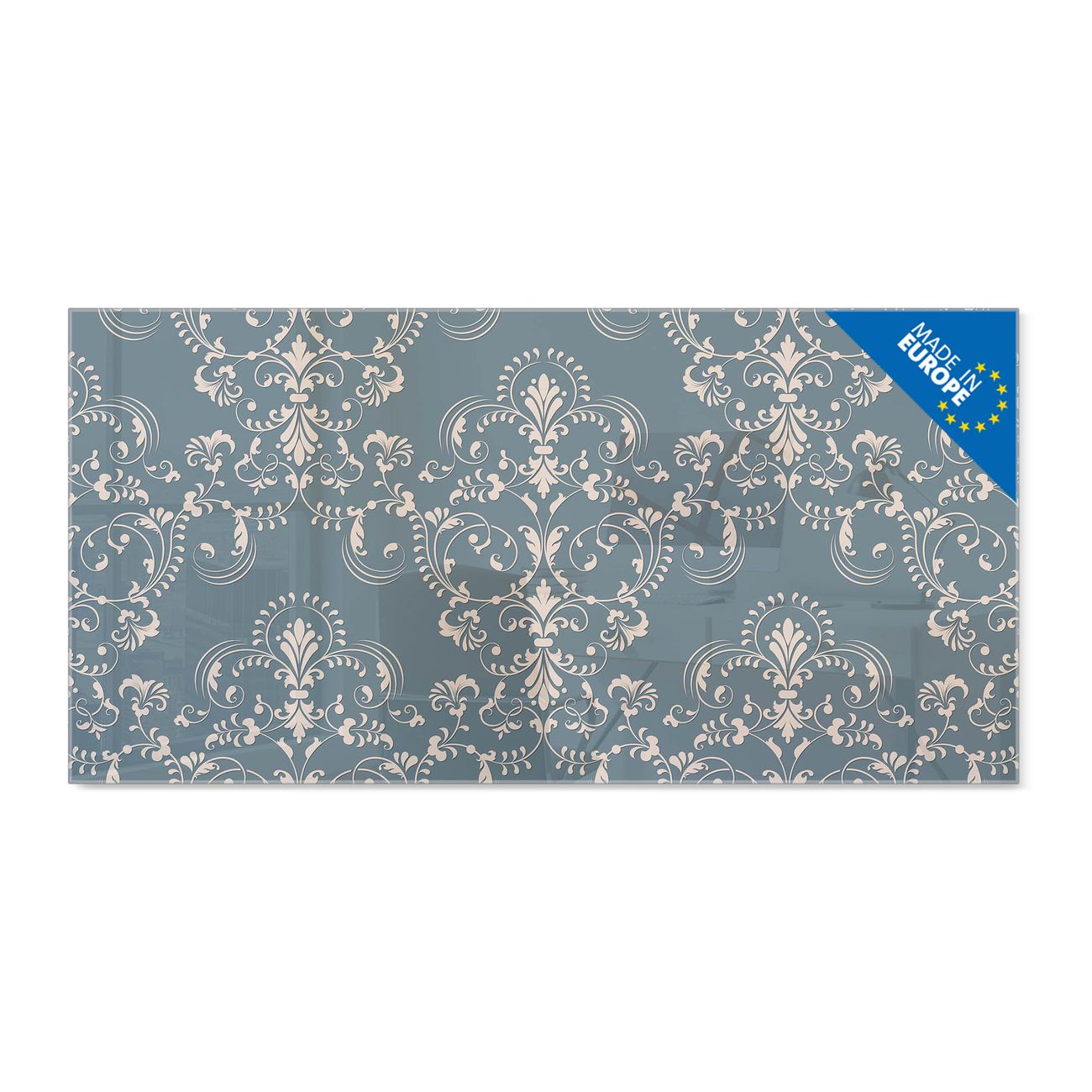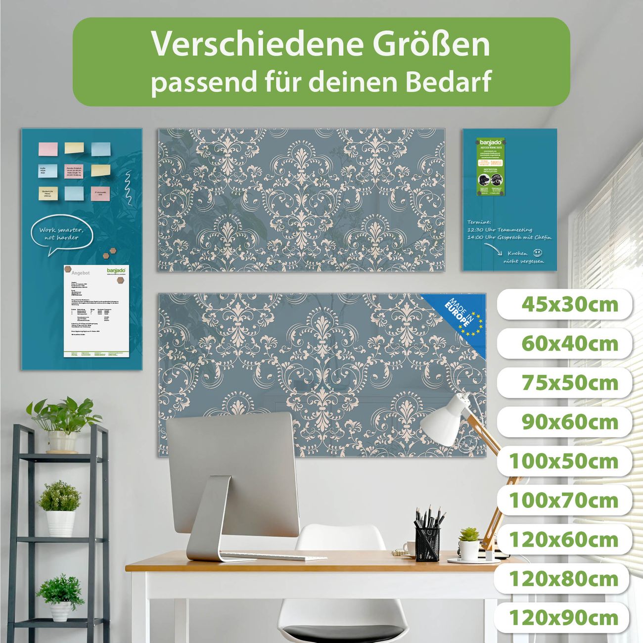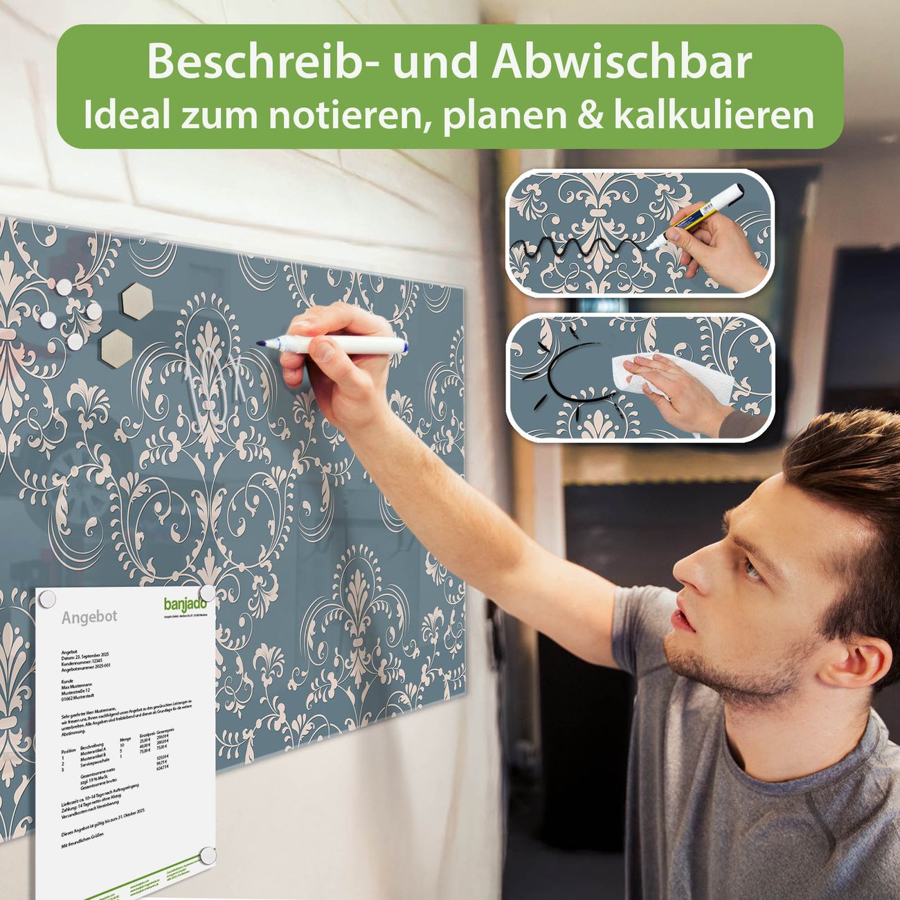 Material: 4mm Sicherheitsglas mit Metallrückwand Eigenschaften: beschreibbar, magnetisch, kratzfest Maße: 100x50x0,6cm, 7,50kg schwer Motiv Nummer 11237 Royal Creme Blau Zubehör: inklusive 4 Neodym-Magnete