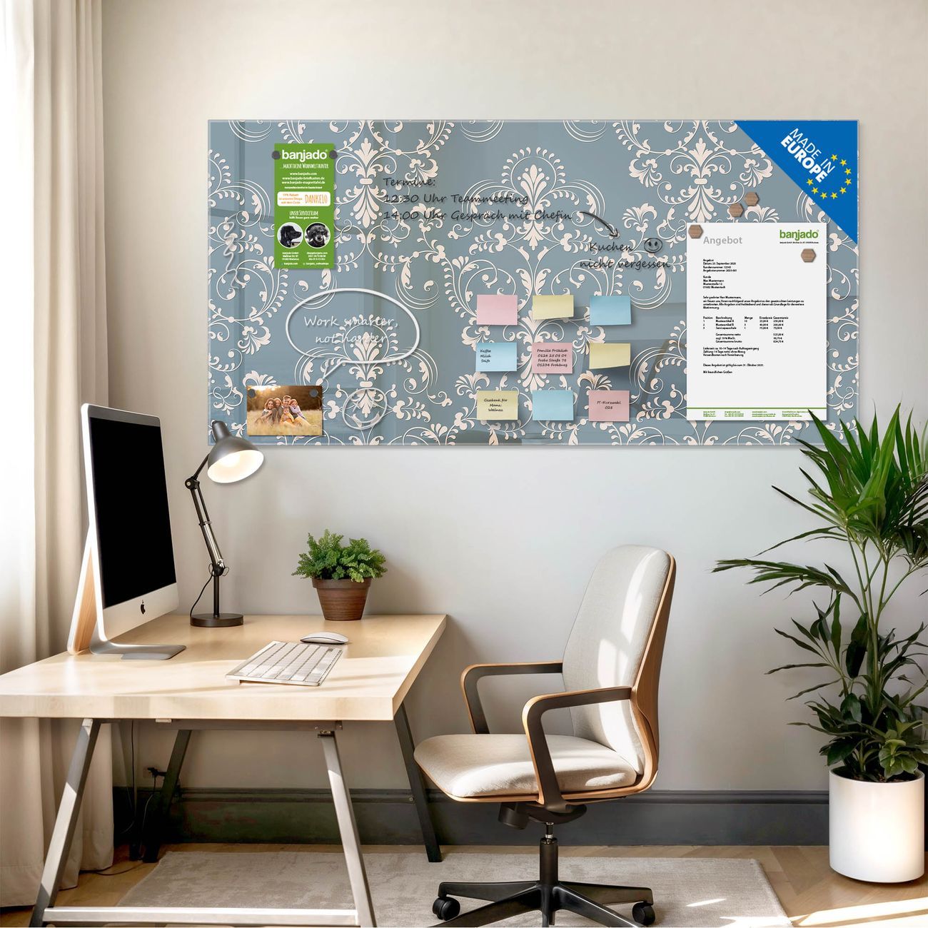 Die banjado Glas Magnettafel mit dem Motiv Motiv Royal Creme Blau verbindet Funktionalität mit Stil. Sie ersetzt das Zettelchaos durch klare Strukturen und bringt dabei eine warme, natürliche Atmosphäre in Ihr Zuhause. Ob im Büro, in der Küche oder im Eingangsbereich - dieses Design-Board zieht Blicke an und sorgt für Ordnung mit Charakter.