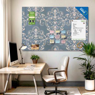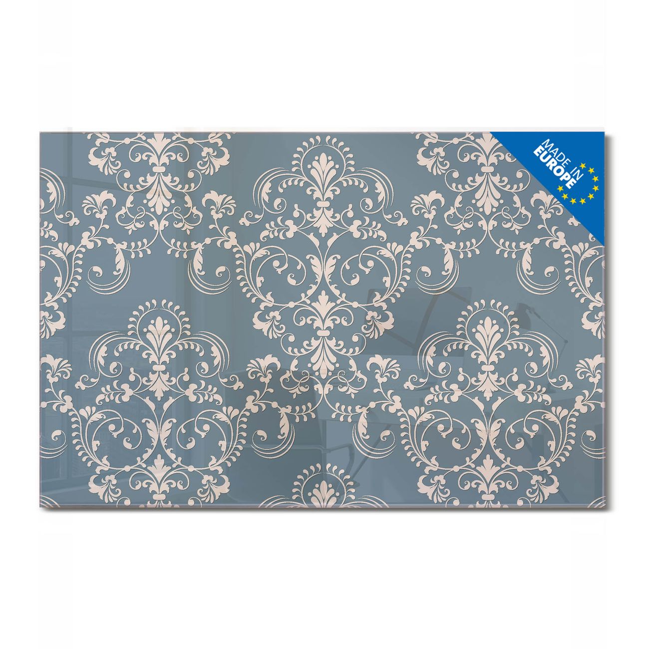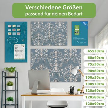 Material: 4mm Sicherheitsglas mit Metallrückwand Eigenschaften: beschreibbar, magnetisch, kratzfest Maße: 90x60x0,6cm, 8,10kg schwer Motiv Nummer 11237 Royal Creme Blau Zubehör: inklusive 4 Neodym-Magnete