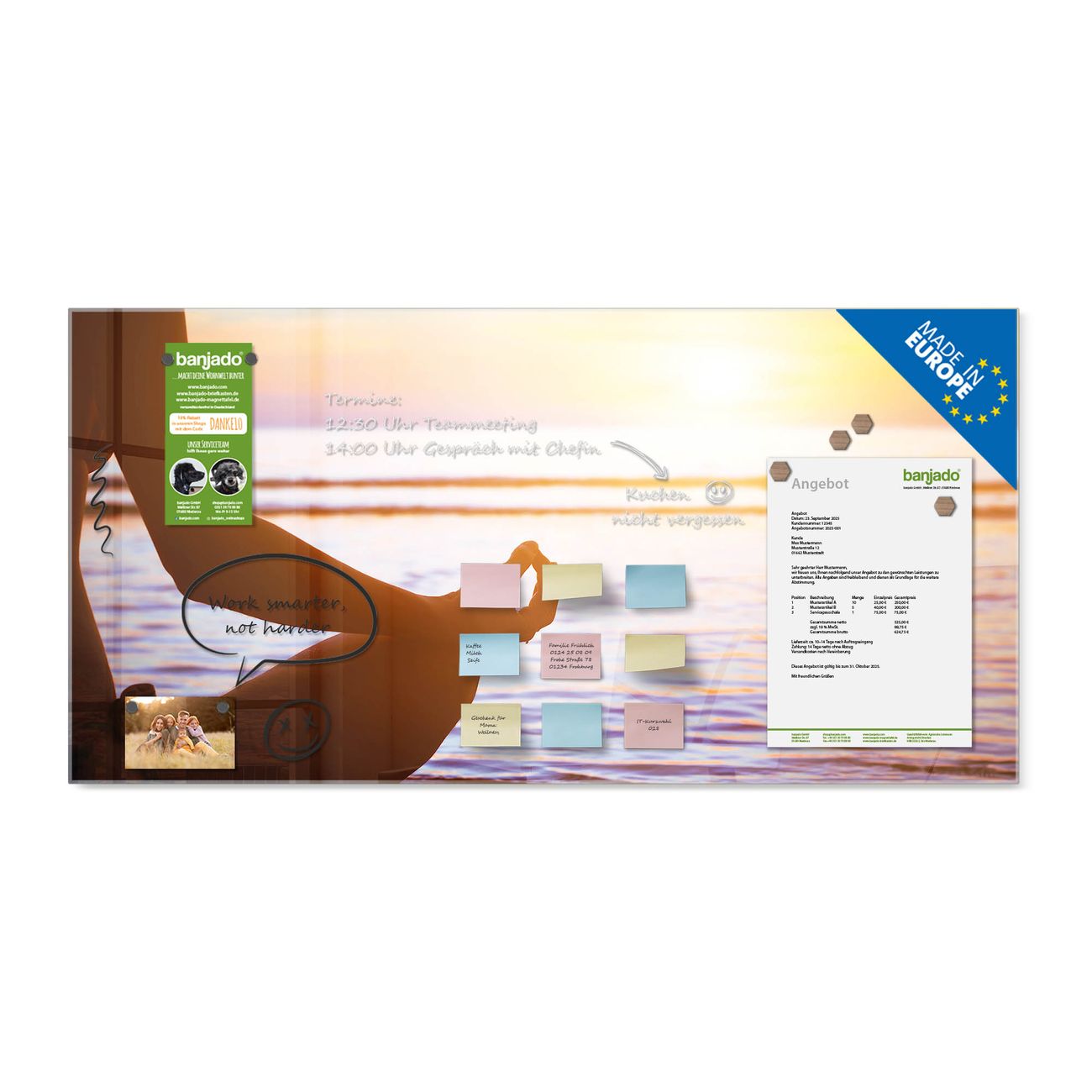 Material: 4mm Sicherheitsglas mit Metallrückwand Eigenschaften: beschreibbar, magnetisch, kratzfest Maße: 110x55x0,6cm, 9,08kg schwer Motiv Nummer 12124 Ruhe Zubehör: inklusive 4 Neodym-Magnete