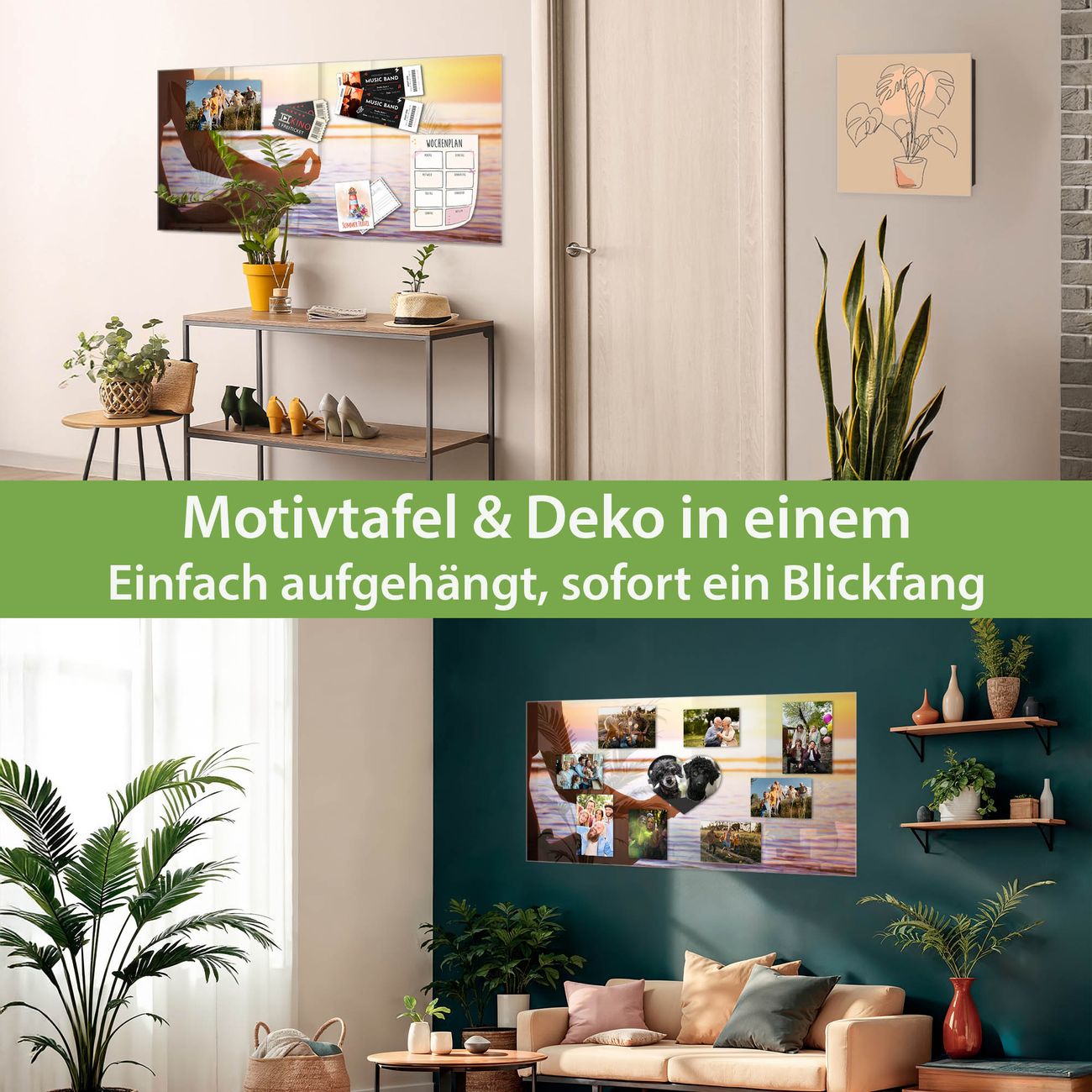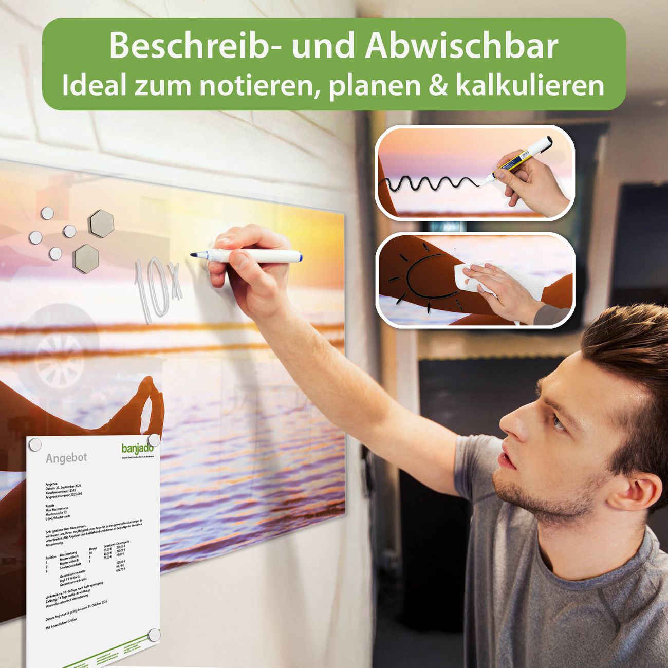 Die banjado Glas Magnettafel mit dem Motiv Motiv Ruhe verbindet Funktionalität mit Stil. Sie ersetzt das Zettelchaos durch klare Strukturen und bringt dabei eine warme, natürliche Atmosphäre in Ihr Zuhause. Ob im Büro, in der Küche oder im Eingangsbereich - dieses Design-Board zieht Blicke an und sorgt für Ordnung mit Charakter.