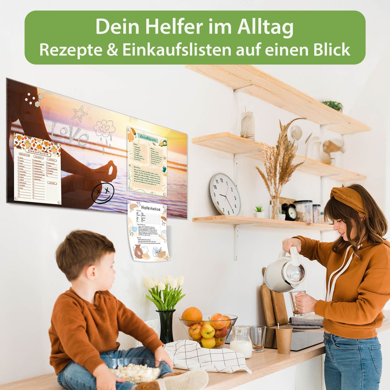 Auf der glatten Glasoberfläche lassen sich Termine, Rezepte oder Notizen ganz einfach mit Kreidestiften festhalten und rückstandslos entfernen. Starke Neodym-Magnete halten Ihre wichtigsten Erinnerungen sicher an Ort und Stelle. So entsteht Ihre ganz persönliche Ideenwand - jeden Tag neu.