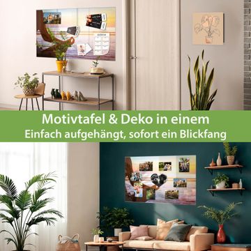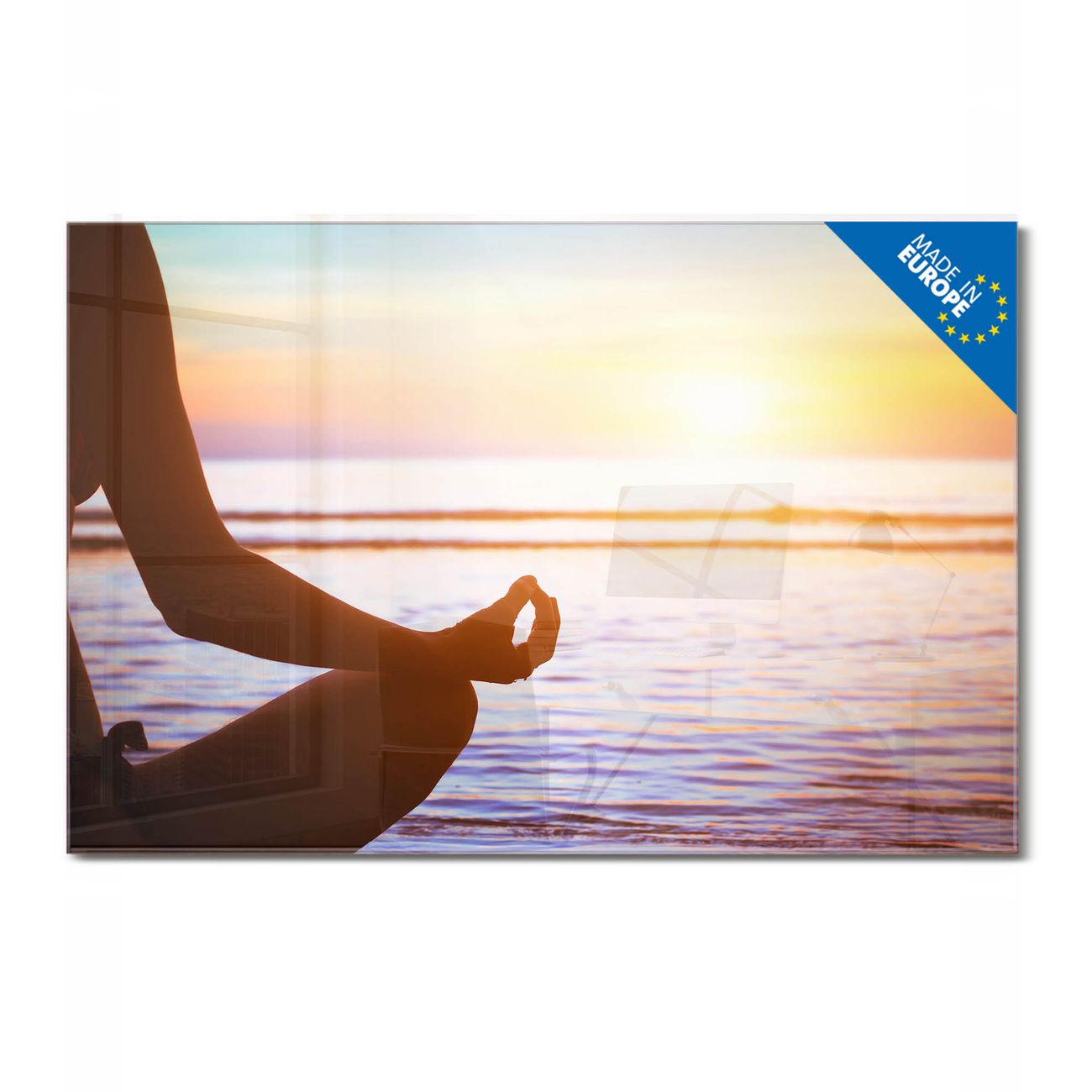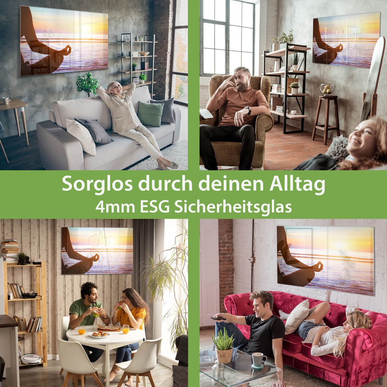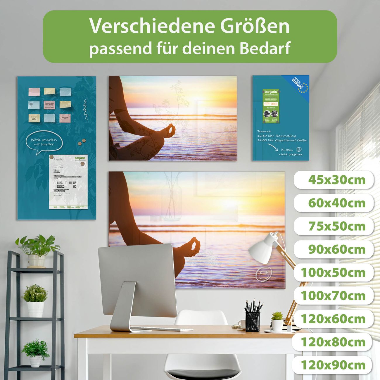 Material: 4mm Sicherheitsglas mit Metallrückwand Eigenschaften: beschreibbar, magnetisch, kratzfest Maße: 120x80x0,6cm, 14,40kg schwer Motiv Nummer 12124 Ruhe Zubehör: inklusive 4 Neodym-Magnete