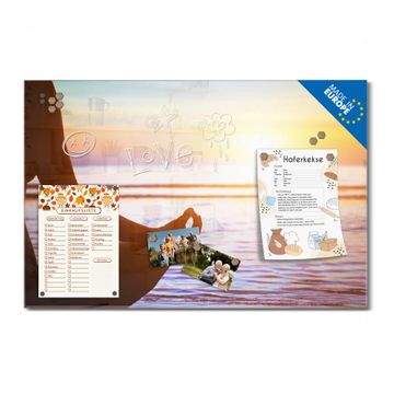 Material: 4mm Sicherheitsglas mit Metallrückwand Eigenschaften: beschreibbar, magnetisch, kratzfest Maße: 75x50x0,6cm, 5,63kg schwer Motiv Nummer 12124 Ruhe Zubehör: inklusive 4 Neodym-Magnete