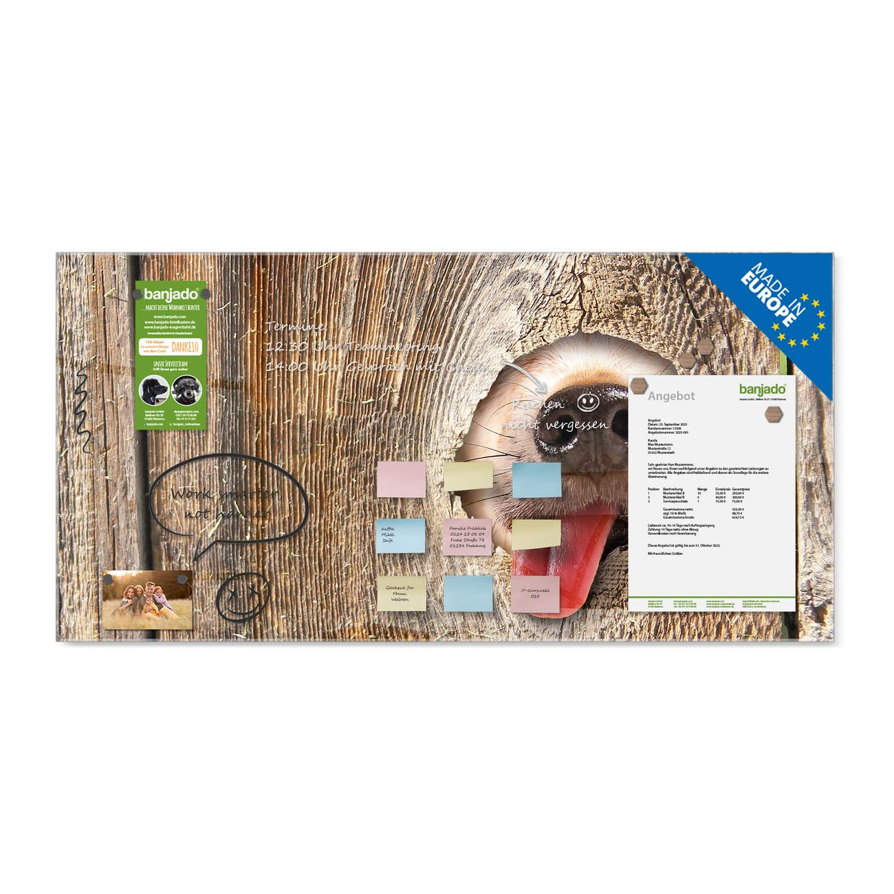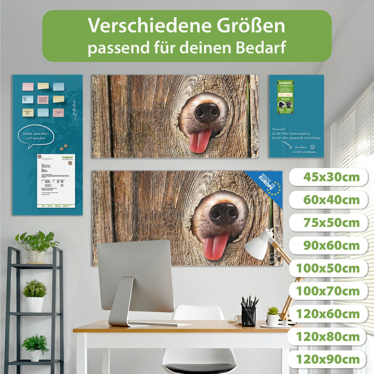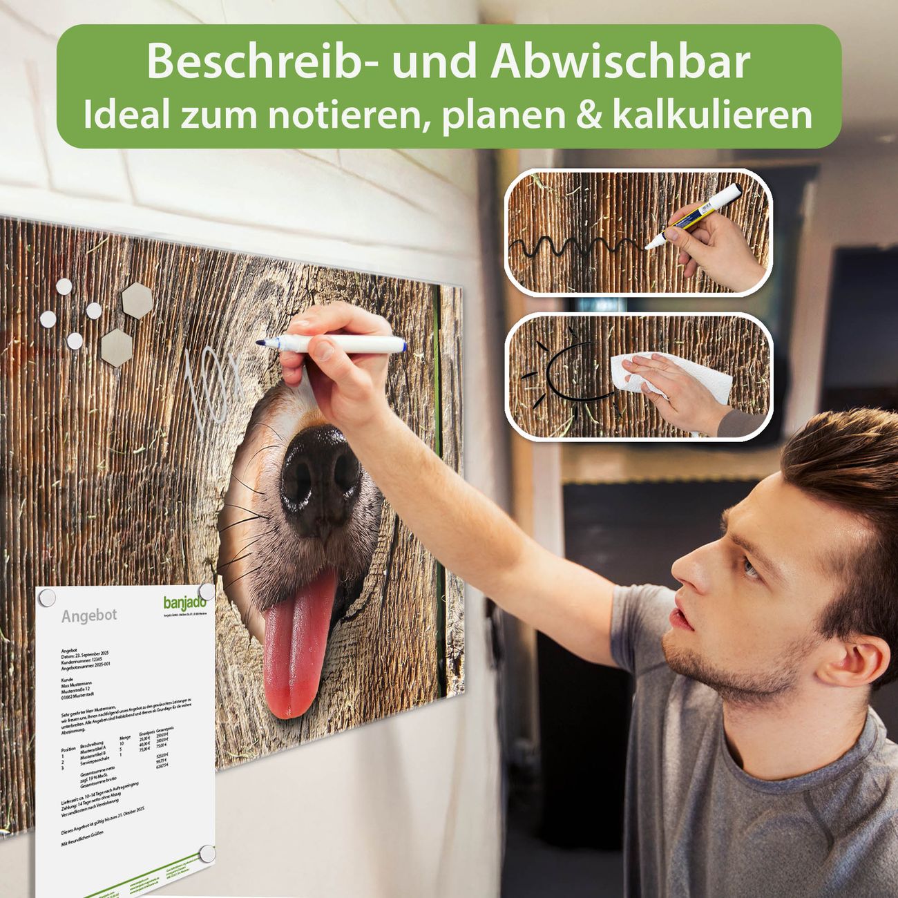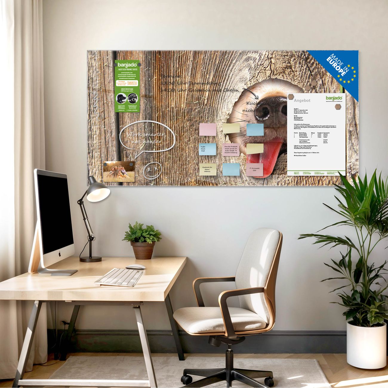Jede Glas Magnettafel wird in unserer Werkstatt von Hand gefertigt und sorgfältig geprüft. So erhalten Sie ein echtes Qualitätsprodukt, das Funktion und Ästhetik perfekt vereint.?? Warum banjado?
