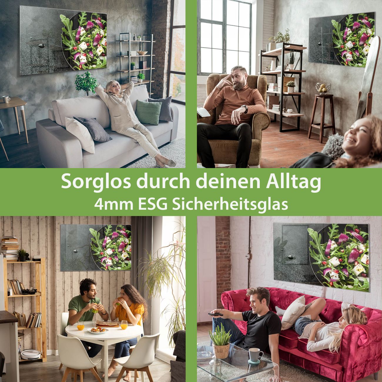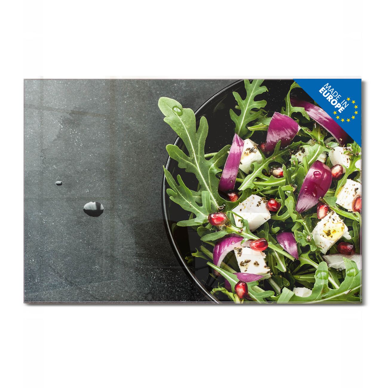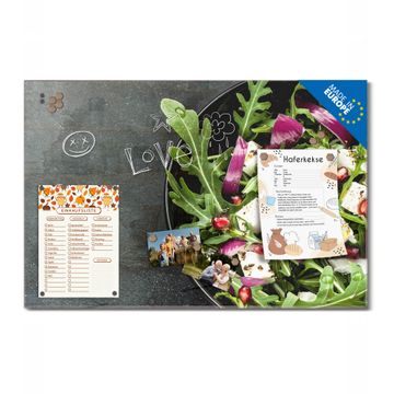 Material: 4mm Sicherheitsglas mit Metallrückwand Eigenschaften: beschreibbar, magnetisch, kratzfest Maße: 75x50x0,6cm, 5,63kg schwer Motiv Nummer 12715 Salat Zubehör: inklusive 4 Neodym-Magnete