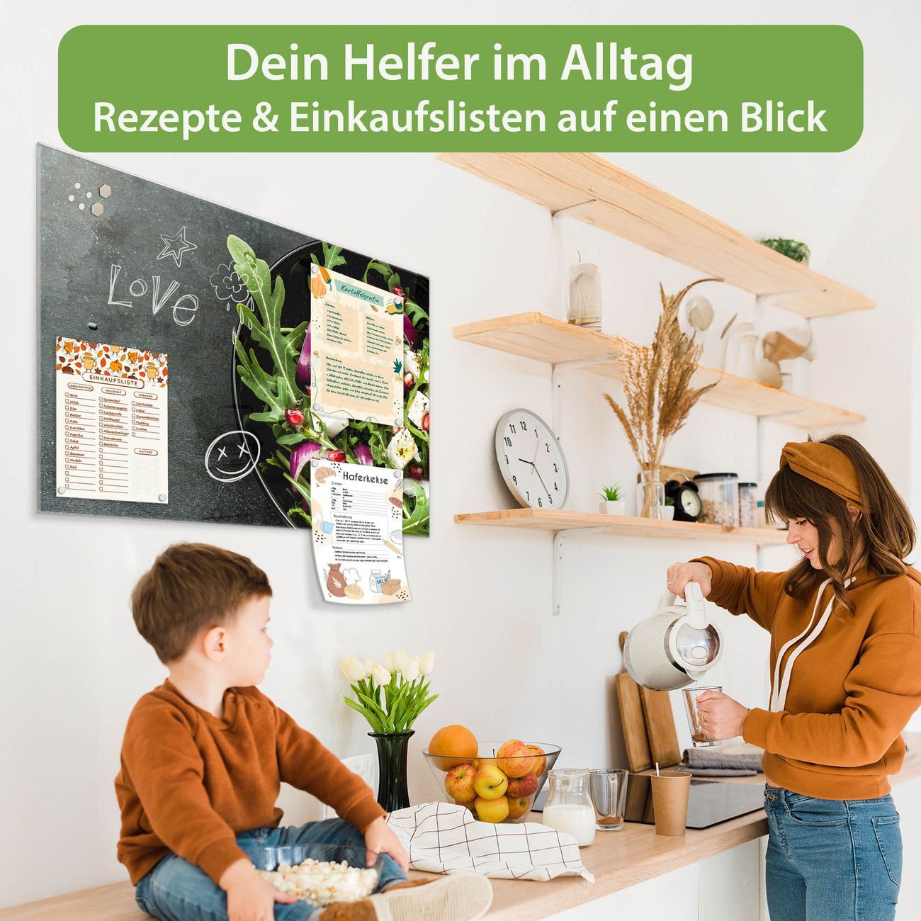 Auf der glatten Glasoberfläche lassen sich Termine, Rezepte oder Notizen ganz einfach mit Kreidestiften festhalten und rückstandslos entfernen. Starke Neodym-Magnete halten Ihre wichtigsten Erinnerungen sicher an Ort und Stelle. So entsteht Ihre ganz persönliche Ideenwand - jeden Tag neu.