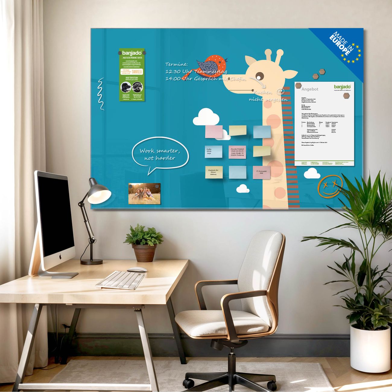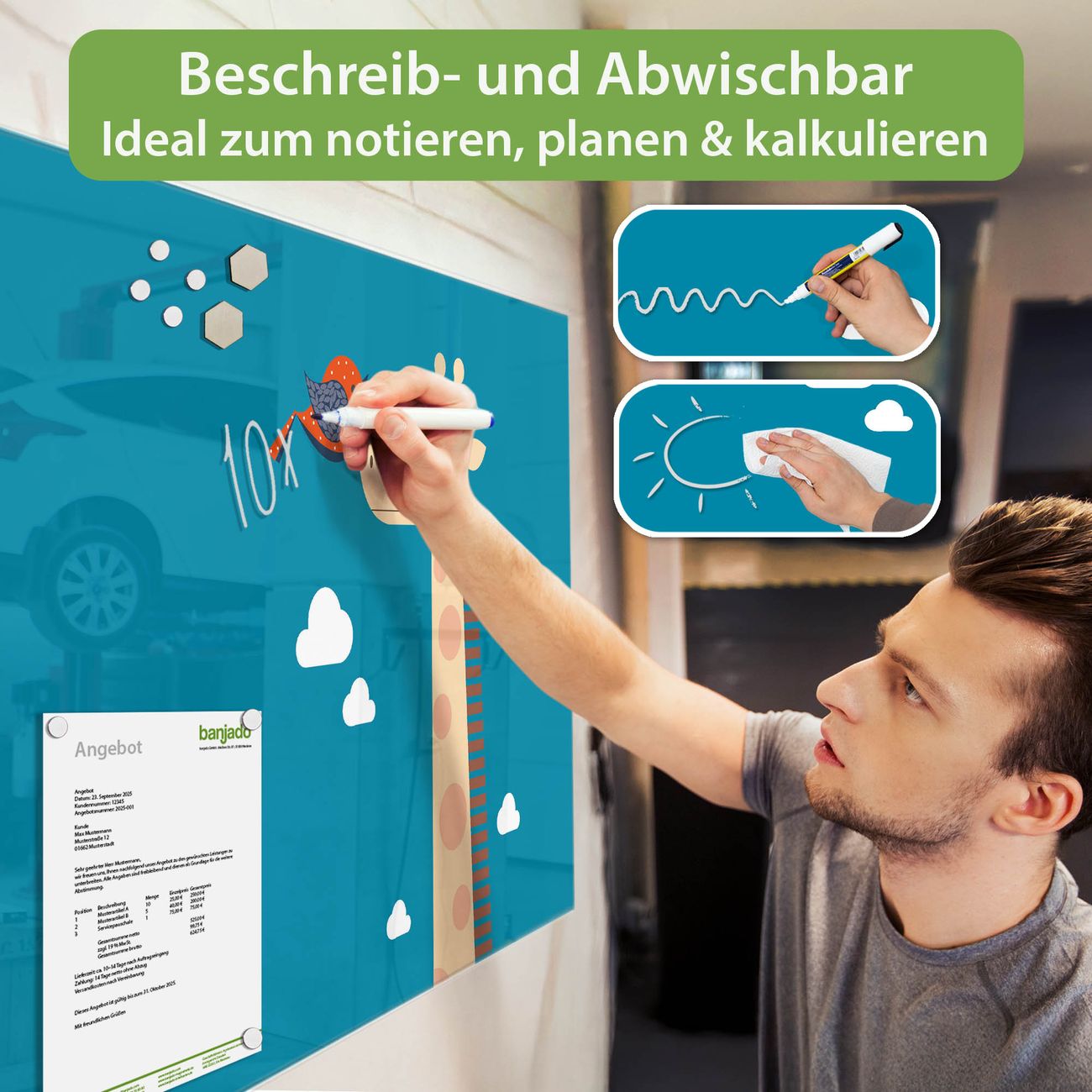 Jede Glas Magnettafel wird in unserer Werkstatt von Hand gefertigt und sorgfältig geprüft. So erhalten Sie ein echtes Qualitätsprodukt, das Funktion und Ästhetik perfekt vereint.?? Warum banjado?