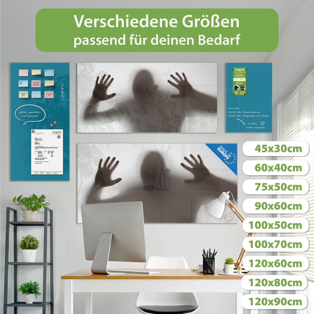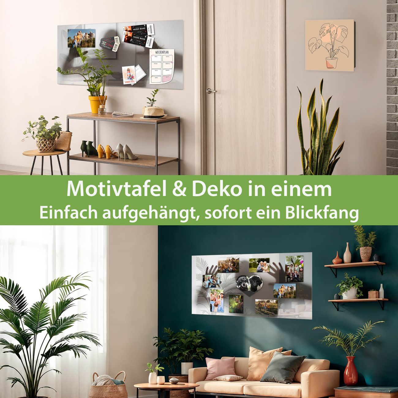 Material: 4mm Sicherheitsglas mit Metallrückwand Eigenschaften: beschreibbar, magnetisch, kratzfest Maße: 120x60x0,6cm, 10,80kg schwer Motiv Nummer 12525 Schattenspiel Zubehör: inklusive 4 Neodym-Magnete