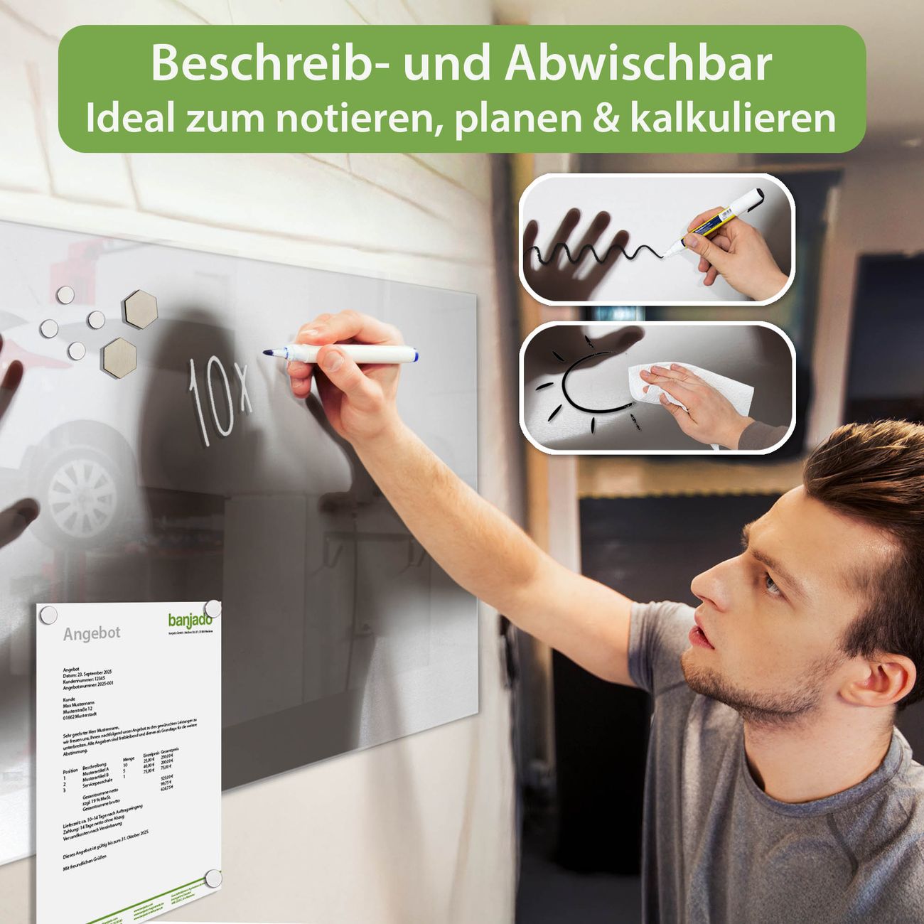 Bitte beachten Sie, dass ausschliessliche spezielle Magnete an der Glastafel haften. Wir empfehlen banjado Neodym Magnete, diese sind durch uns auf Wirksamkeit geprüft.