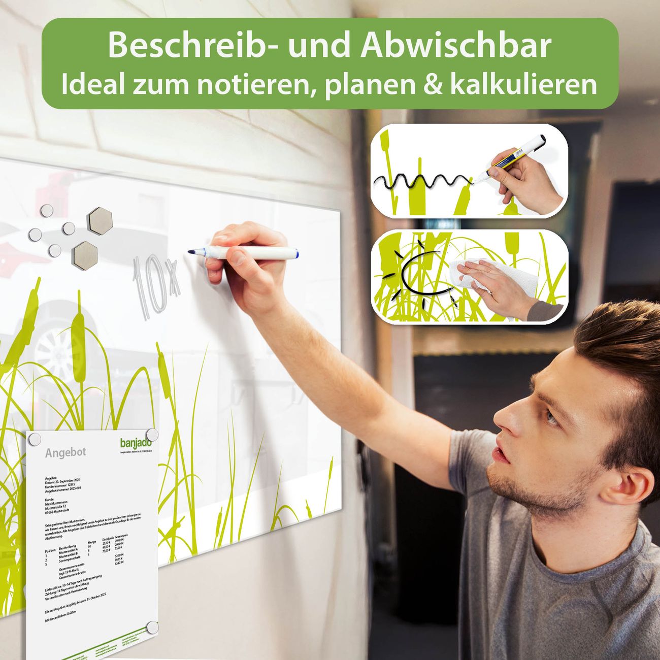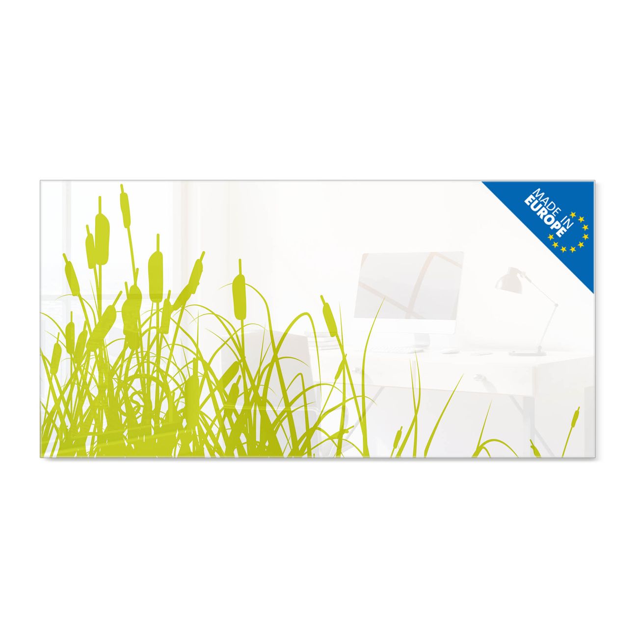 Material: 4mm Sicherheitsglas mit Metallrückwand Eigenschaften: beschreibbar, magnetisch, kratzfest Maße: 100x50x0,6cm, 7,50kg schwer Motiv Nummer 10371 Schilf Zubehör: inklusive 4 Neodym-Magnete