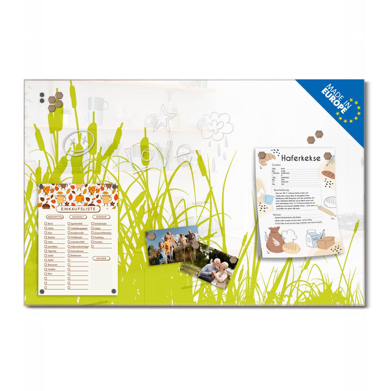 Material: 4mm Sicherheitsglas mit Metallrückwand Eigenschaften: beschreibbar, magnetisch, kratzfest Maße: 75x50x0,6cm, 5,63kg schwer Motiv Nummer 10371 Schilf Zubehör: inklusive 4 Neodym-Magnete