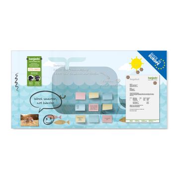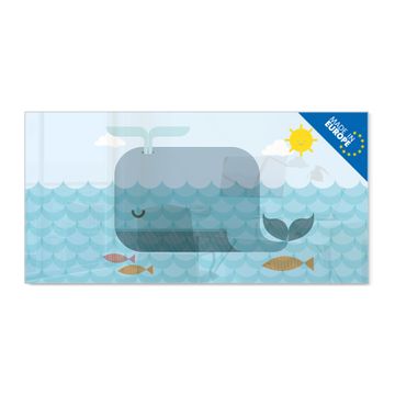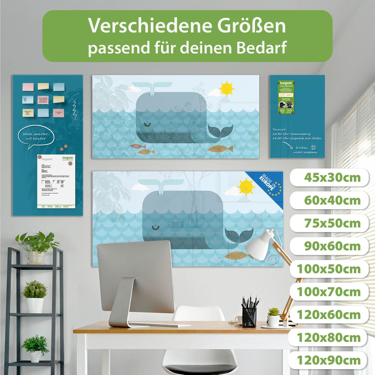 Material: 4mm Sicherheitsglas mit Metallrückwand Eigenschaften: beschreibbar, magnetisch, kratzfest Maße: 110x55x0,6cm, 9,08kg schwer Motiv Nummer 11765 Schlafender Wal Zubehör: inklusive 4 Neodym-Magnete