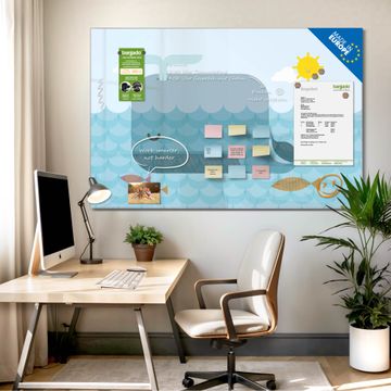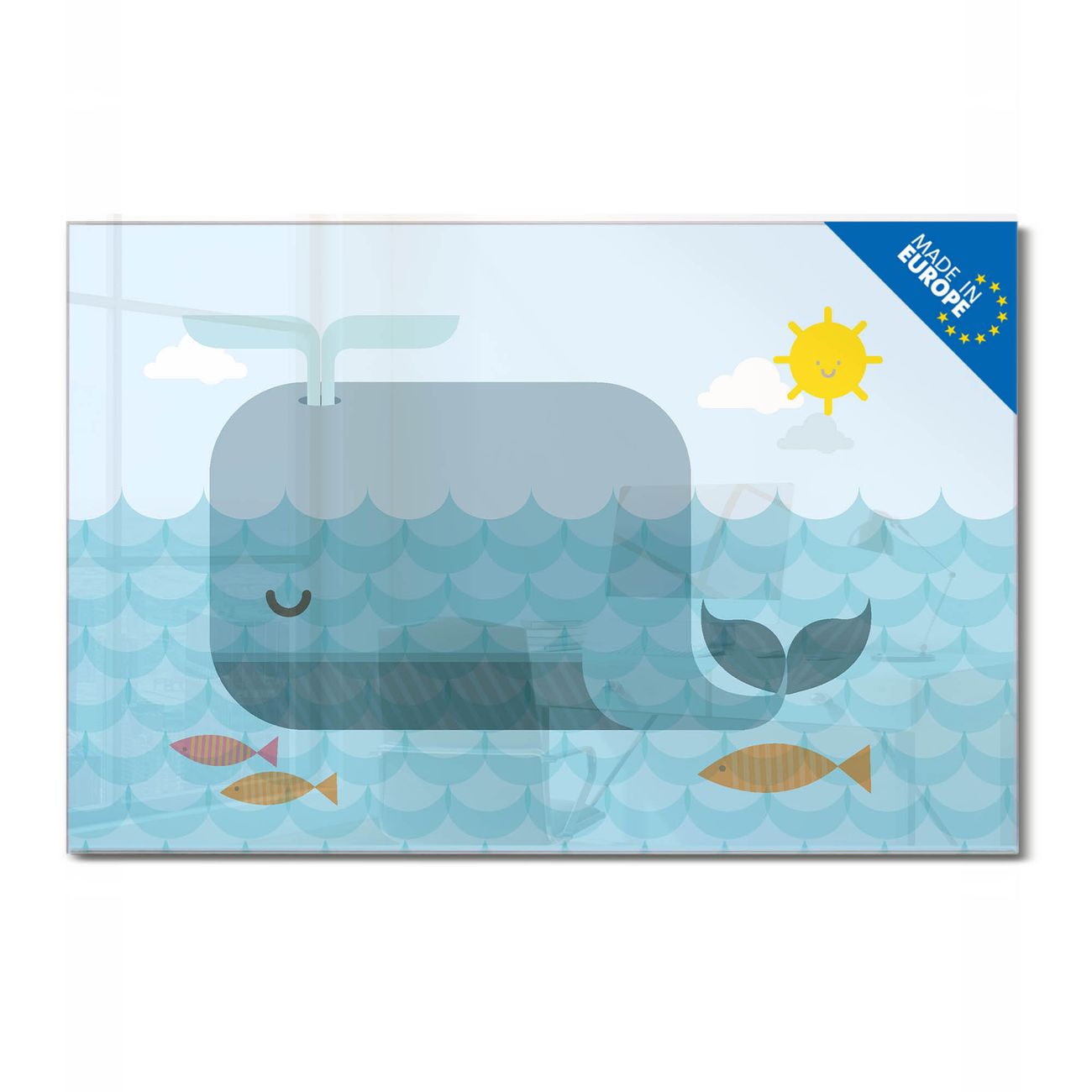 Material: 4mm Sicherheitsglas mit Metallrückwand Eigenschaften: beschreibbar, magnetisch, kratzfest Maße: 75x50x0,6cm, 5,63kg schwer Motiv Nummer 11765 Schlafender Wal Zubehör: inklusive 4 Neodym-Magnete