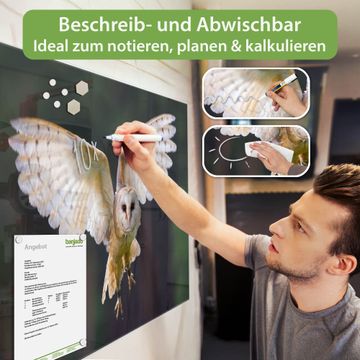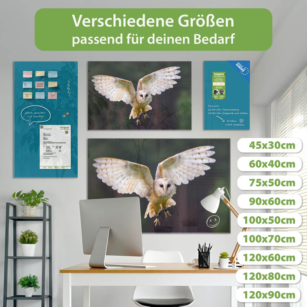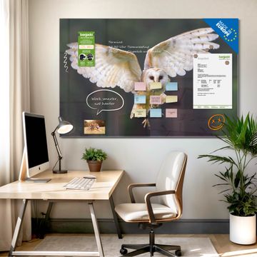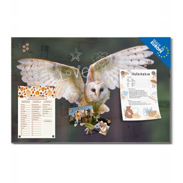 Material: 4mm Sicherheitsglas mit Metallrückwand Eigenschaften: beschreibbar, magnetisch, kratzfest Maße: 45x30x0,6cm, 2,03kg schwer Motiv Nummer 10503 Schleiereule Zubehör: inklusive 4 Neodym-Magnete